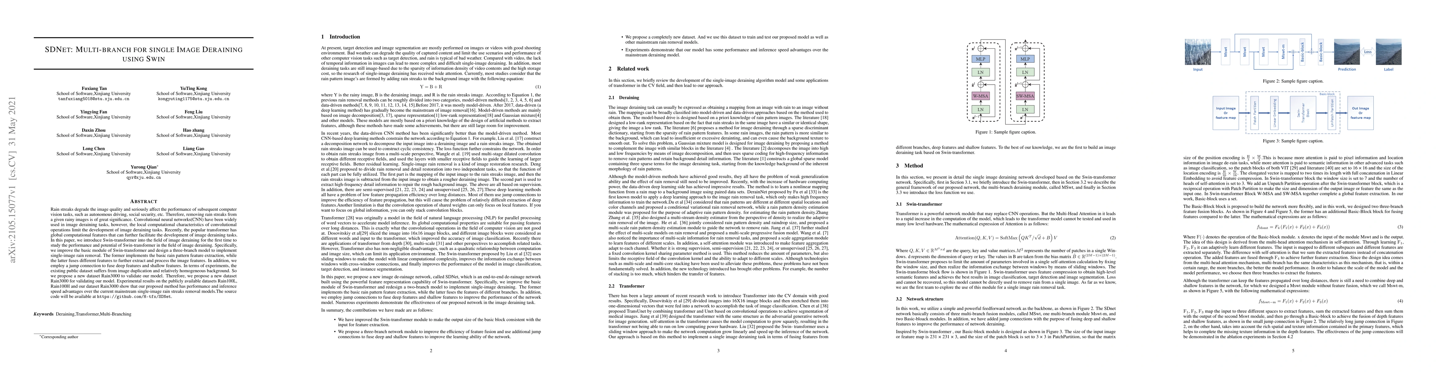 The paper introduces SDNet, a multi-branch model using Swin-transformer for single image deraining, which outperforms existing CNN-based methods by leveraging global computational features and a new dataset, Rain3000, for validation. The proposed method shows superior performance and faster inference speeds on Rain100L, Rain100H, and Rain3000 datasets.