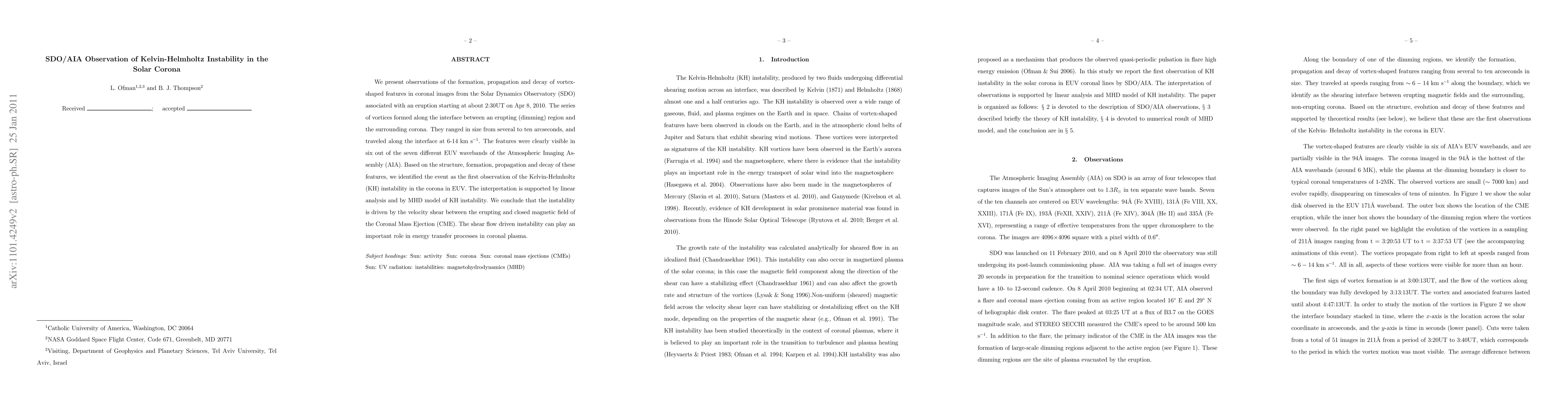 This paper reports the first observations of Kelvin-Helmholtz instability in the solar corona using SDO/AIA data, identifying vortex-shaped features formed due to velocity shear between an erupting region and surrounding corona. These features, visible in multiple EUV wavebands, suggest a significant role in coronal plasma energy transfer.