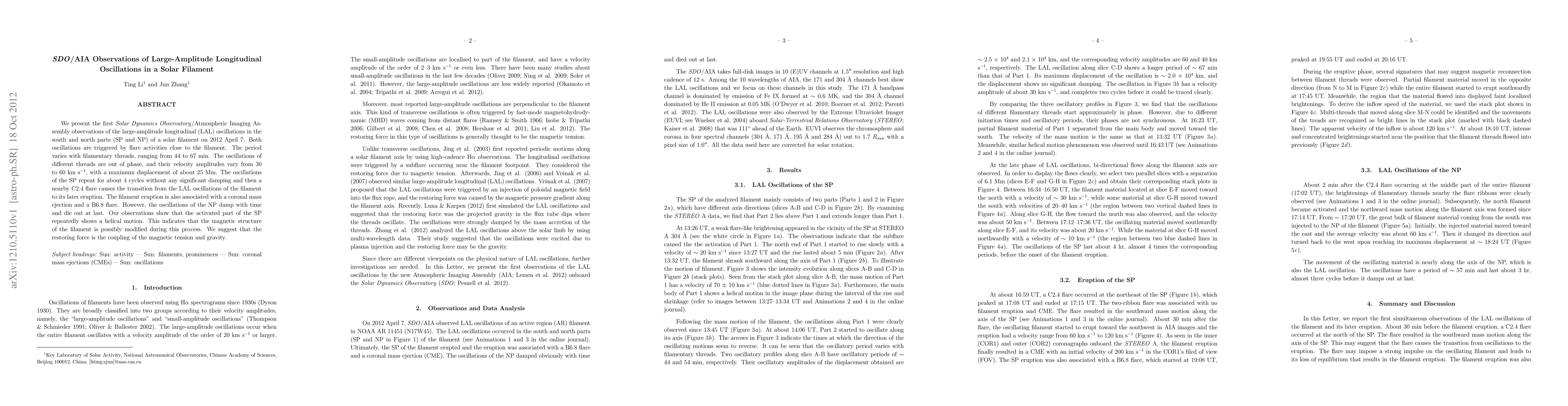 We present the first \emph{Solar Dynamics Observatory}/Atmospheric Imaging Assembly observations of the large-amplitude longitudinal (LAL) oscillations in the south and north parts (SP and NP) of a solar filament on 2012 April 7. Both oscillations are triggered by flare activities close to the filament. The period varies with filamentary threads, ranging from 44 to 67 min. The oscillations of different threads are out of phase, and their velocity amplitudes vary from 30 to 60 km s$^{-1}$, with a maximum displacement of about 25 Mm. The oscillations of the SP repeat for about 4 cycles without any significant damping and then a nearby C2.4 flare causes the transition from the LAL oscillations of the filament to its later eruption. The filament eruption is also associated with a coronal mass ejection and a B6.8 flare. However, the oscillations of the NP damp with time and die out at last. Our observations show that the activated part of the SP repeatedly shows a helical motion. This indicates that the magnetic structure of the filament is possibly modified during this process. We suggest that the restoring force is the coupling of the magnetic tension and gravity.