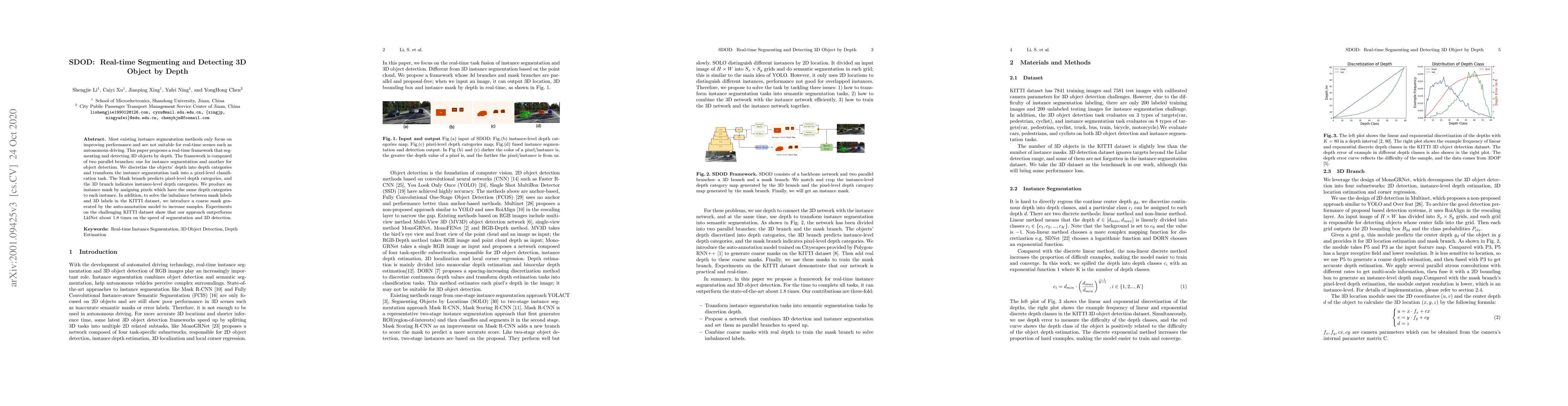 This paper introduces a real-time framework for segmenting and detecting 3D objects using depth, featuring two parallel branches for instance segmentation and object detection. The method discretizes depth into categories, transforming instance segmentation into a pixel-level classification task, and outperforms LklNet by 1.8 times in speed on the KITTI dataset.