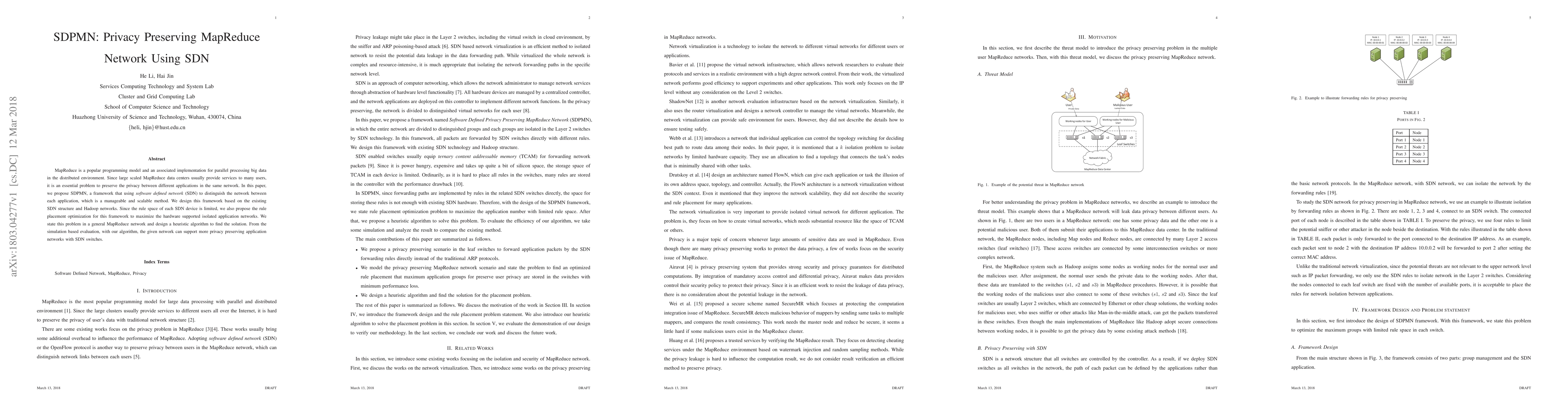 This paper proposes SDPMN, a privacy-preserving MapReduce network framework using SDN to isolate applications within a shared network. It optimizes rule placement in SDN devices to maximize isolated application networks, employing a heuristic algorithm to solve the problem, thereby enhancing privacy in large-scale MapReduce data centers.