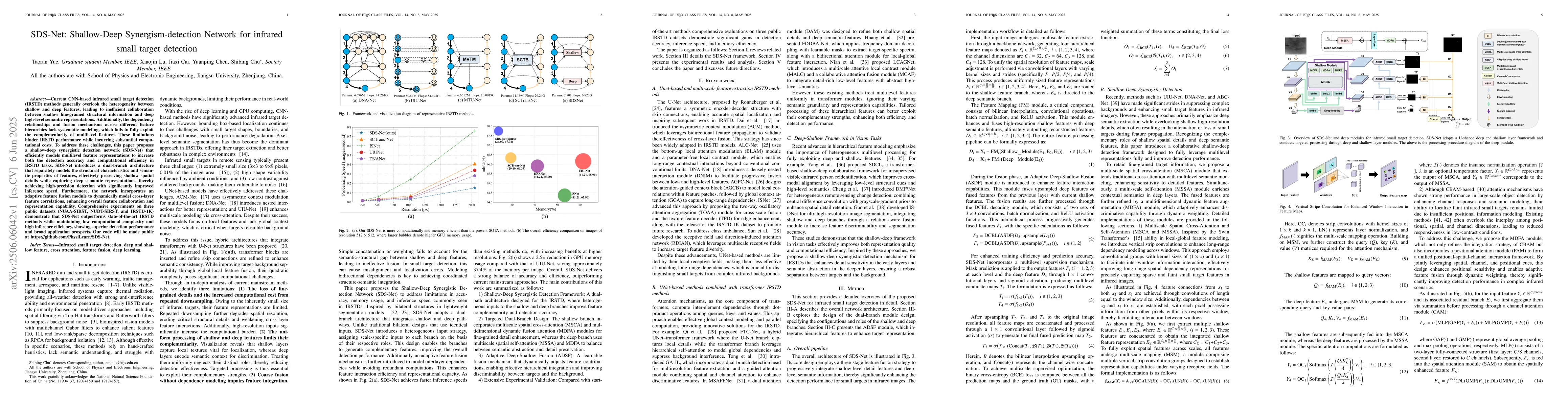 The paper proposes SDS-Net, a shallow-deep synergistic detection network that models multilevel feature representations for infrared small target detection (IRSTD) tasks. It features a dual-branch architecture to separately model structural characteristics and semantic properties of features, along with an adaptive feature fusion module for dynamic cross-layer feature correlation modeling.