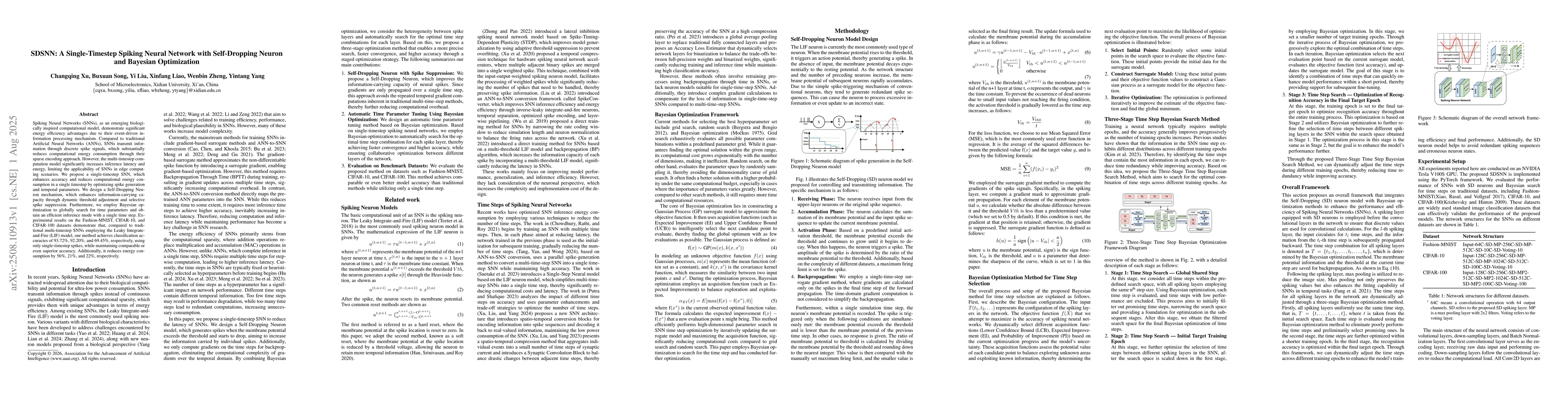 Spiking Neural Networks (SNNs), as an emerging biologically inspired computational model, demonstrate significant energy efficiency advantages due to their event-driven information processing mechanism. Compared to traditional Artificial Neural Networks (ANNs), SNNs transmit information through discrete spike signals, which substantially reduces computational energy consumption through their sparse encoding approach. However, the multi-timestep computation model significantly increases inference latency and energy, limiting the applicability of SNNs in edge computing scenarios. We propose a single-timestep SNN, which enhances accuracy and reduces computational energy consumption in a single timestep by optimizing spike generation and temporal parameters. We design a Self-Dropping Neuron mechanism, which enhances information-carrying capacity through dynamic threshold adjustment and selective spike suppression. Furthermore, we employ Bayesian optimization to globally search for time parameters and obtain an efficient inference mode with a single time step. Experimental results on the Fashion-MNIST, CIFAR-10, and CIFAR-100 datasets demonstrate that, compared to traditional multi-timestep SNNs employing the Leaky Integrate-and-Fire (LIF) model, our method achieves classification accuracies of 93.72%, 92.20%, and 69.45%, respectively, using only single-timestep spikes, while maintaining comparable or even superior accuracy. Additionally, it reduces energy consumption by 56%, 21%, and 22%, respectively.