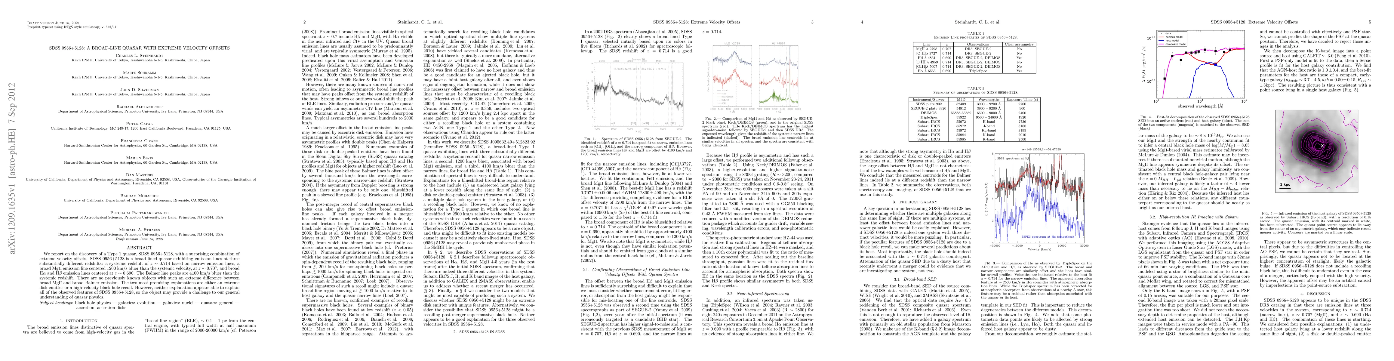 SDSS 0956+5128 is a broad-line quasar with unusual velocity offsets, featuring emission lines at three distinct redshifts, challenging current models of quasar physics. The broad MgII line is 1200 km/s bluer, while H\alpha and H\beta lines are 4100 km/s bluer than the systemic redshift, complicating explanations for its extreme behavior.