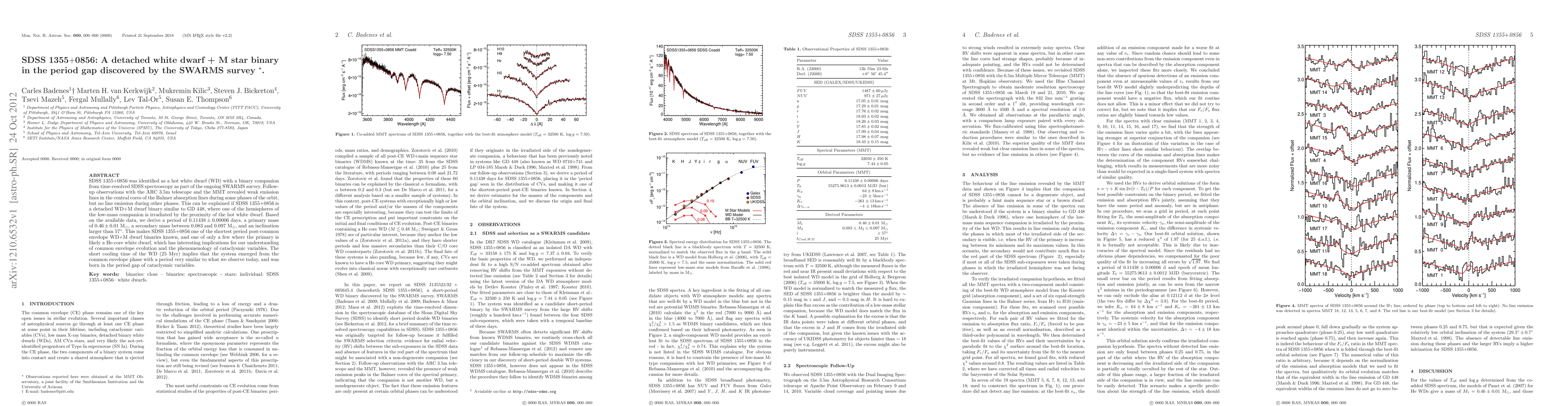 SDSS 1355+0856 is a detached white dwarf + M star binary discovered in the period gap by the SWARMS survey, featuring weak emission lines indicative of irradiation from the white dwarf. The system has a short orbital period and provides insights into common envelope evolution and cataclysmic variable phenomenology.