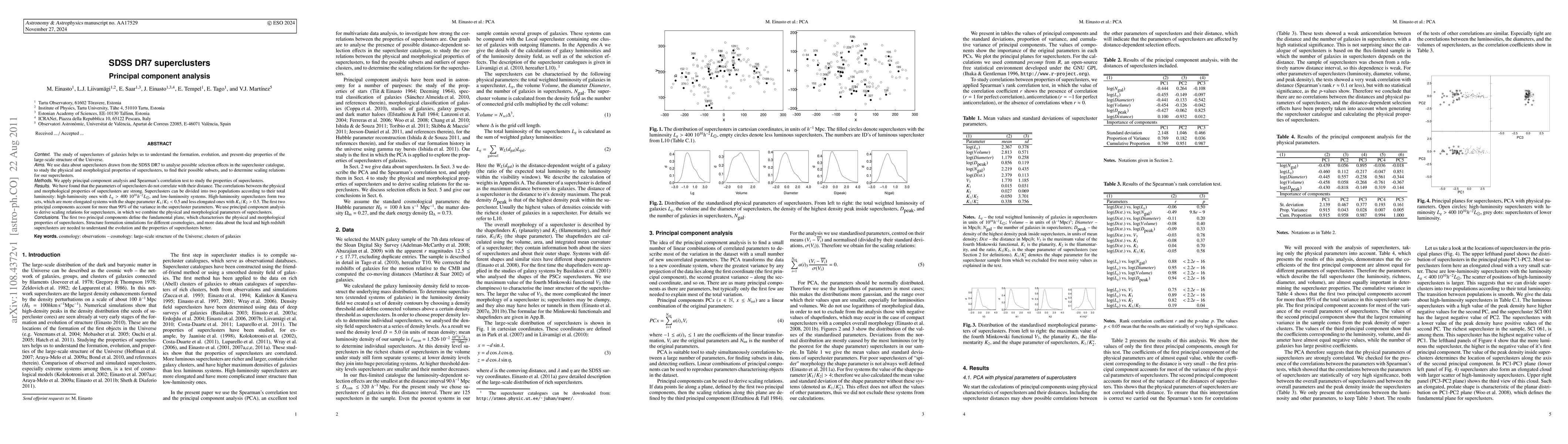 This paper uses principal component analysis and Spearman's correlation test to study SDSS DR7 superclusters, revealing strong correlations between their physical and morphological properties and identifying two luminosity-based populations. The first two principal components define a fundamental plane characterizing supercluster properties.