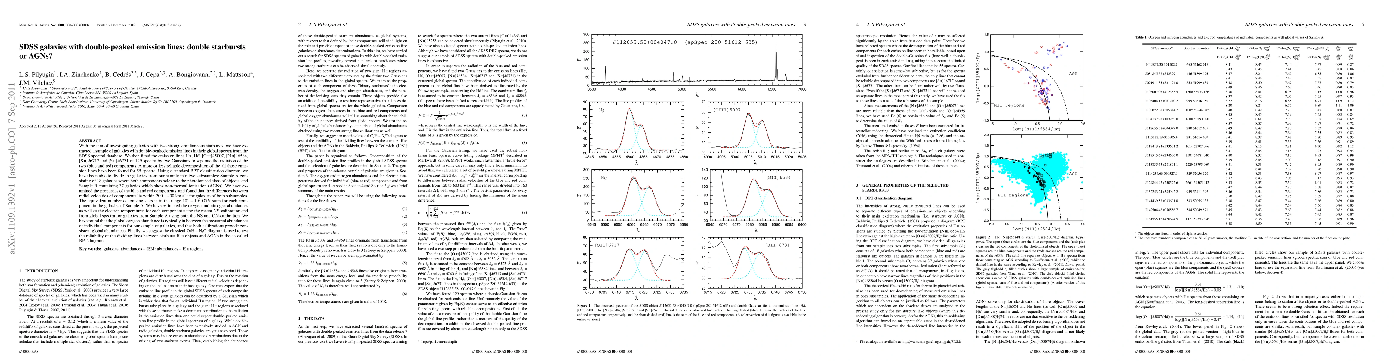 This study investigates SDSS galaxies with double-peaked emission lines, suggesting either double starbursts or AGNs. The analysis of 129 spectra reveals two subsamples: Sample A with photoionised components, and Sample B with non-thermal ionisation indicative of AGNs, using BPT classification and emission line decomposition.