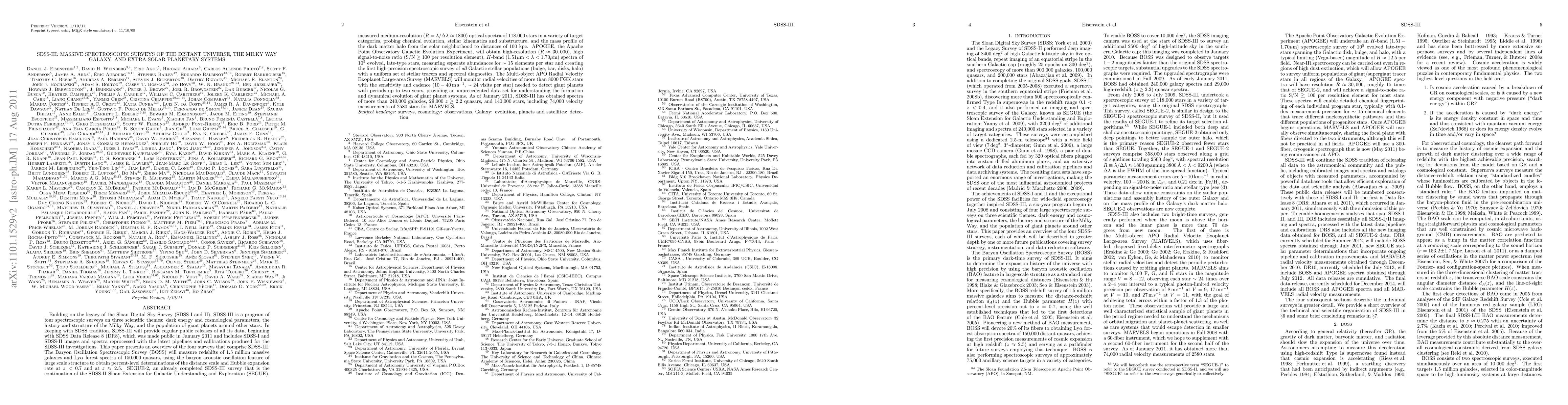 SDSS-III extends the Sloan Digital Sky Survey to explore dark energy, Milky Way structure, and extra-solar planets through four spectroscopic surveys: BOSS, SEGUE-2, APOGEE, and MARVELS, each targeting different aspects of cosmology and stellar populations.