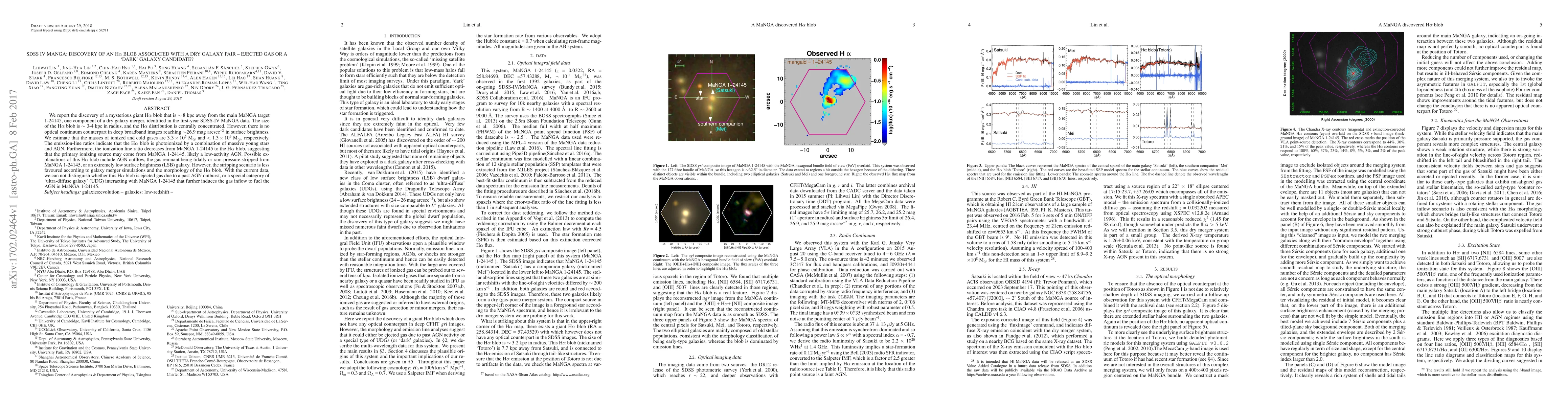 The SDSS IV MaNGA survey identified a large $H_{\alpha}$ blob near a dry galaxy merger, with no optical counterpart, suggesting it could be ejected gas or a dark galaxy. The blob's ionization likely originates from a low-activity AGN in the nearby galaxy.