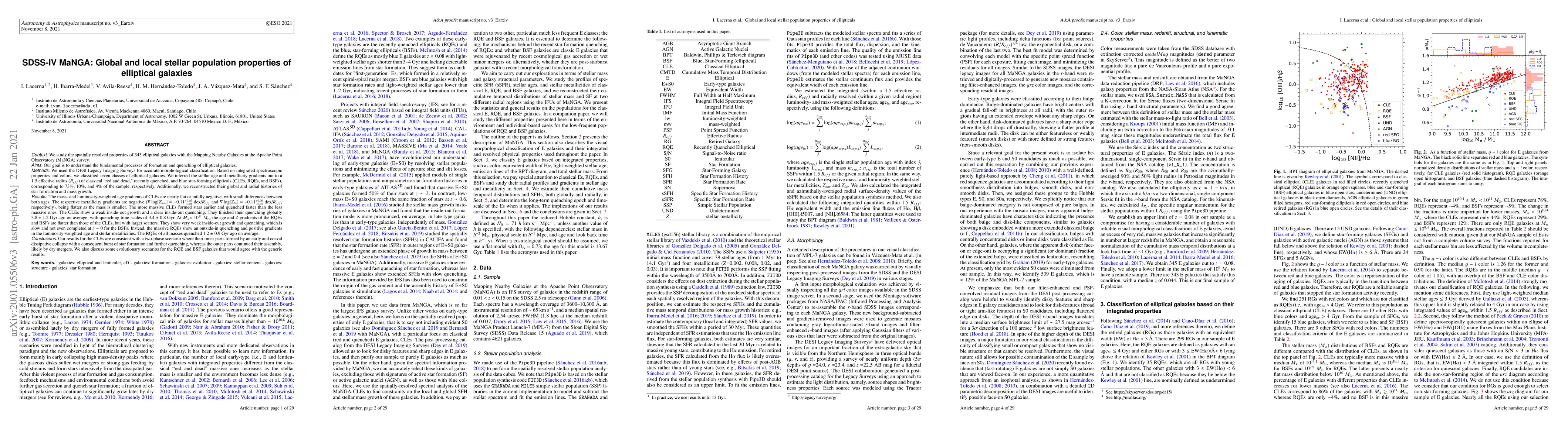 This paper investigates the stellar population properties of 343 elliptical galaxies using the MaNGA/SDSS-IV survey, classifying them into seven types based on integrated properties. It finds that classical ellipticals show weak inside-out growth and quenching, while recently quenched and blue star-forming ellipticals exhibit more complex and varied evolutionary histories.