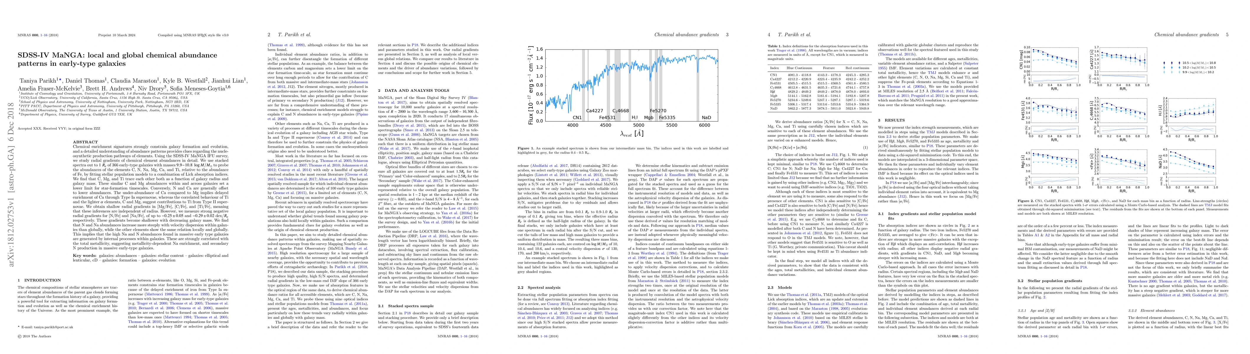 The SDSS-IV MaNGA survey reveals detailed chemical abundance patterns in early-type galaxies, showing that C, Mg, and Ti correlate closely with each other, while N and Ca exhibit lower abundances. The study finds shallow radial gradients for C, Mg, and Ti, but strong negative gradients for N and Na, suggesting internal processes drive high Na and N abundances in massive galaxies.