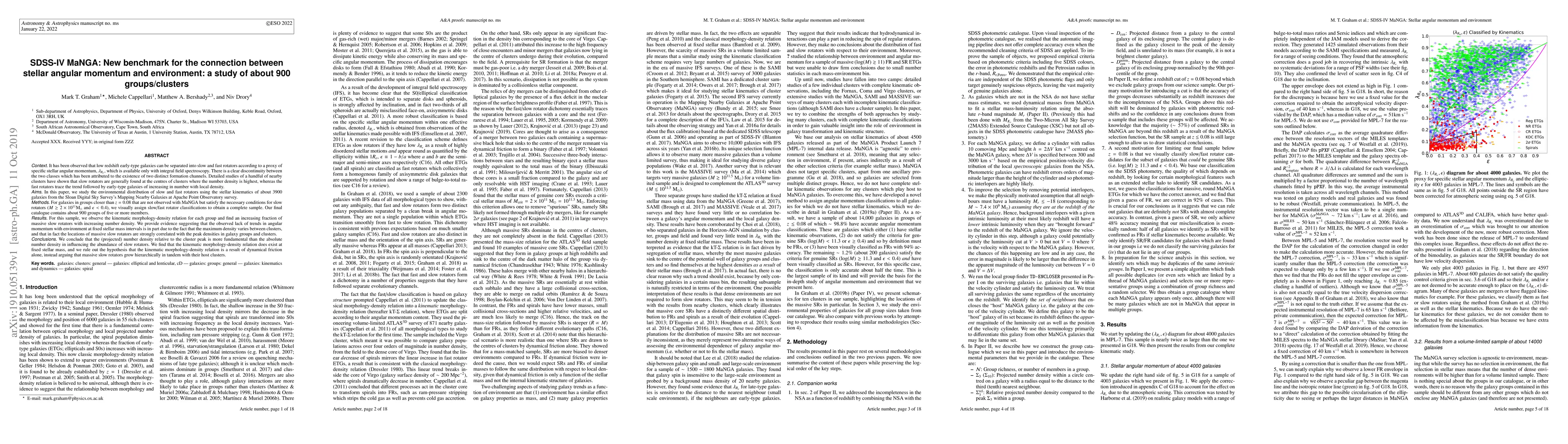 It has been observed that low redshift early-type galaxies can be separated into slow and fast rotators according to a proxy of specific stellar angular momentum, $\lambda_{R_e}$. Detailed studies of a handful of nearby clusters have shown that slow rotators are generally found at the centres of clusters where the number density is highest, whereas the fast rotators trace the trend followed by early-type galaxies of increasing in number with local density. In this paper, we study the environmental distribution of slow and fast rotators using the stellar kinematics of about 3900 galaxies from the Sloan Digital Sky Survey's Mapping Nearby Galaxies at Apache Point Observatory survey. For galaxies in groups closer than $z=0.08$ that are not observed with MaNGA but satisfy the necessary conditions for slow rotators, we visually assign slow/fast rotator classifications to obtain a complete sample. Our final catalogue contains about 900 groups of five or more members. We observe the kinematic morphology-density (kT-$\Sigma$) relation for each group and find an increasing fraction of massive slow rotators with increasing number density. We provide evidence suggesting that the observed lack of trends in angular momentum with environment at fixed stellar mass is partly because the maximum density varies between clusters, and that the locations of massive slow rotators are strongly correlated with peak densities in galaxy groups and clusters. We conclude that the (projected) number density relative to the cluster peak is more fundamental than the absolute number density in influencing the abundance of slow rotators. We find that the kT-$\Sigma$ relation does exist at fixed stellar mass, and we rule out the hypothesis that the kT-$\Sigma$ relation is a result of dynamical friction alone, instead arguing that massive slow rotators grow hierarchically in tandem with their host clusters.