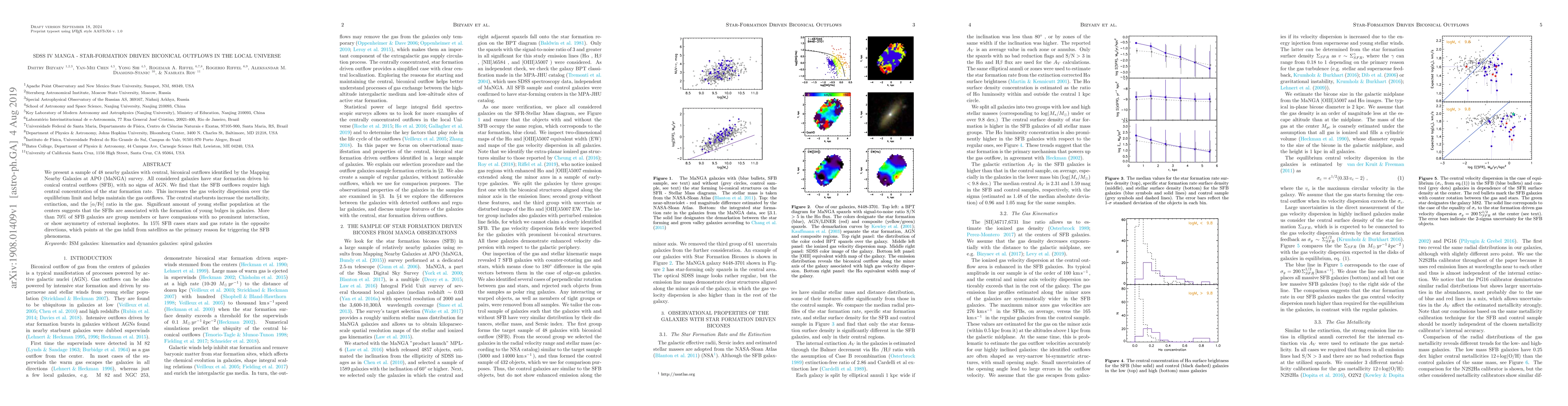 The MaNGA survey identifies 48 nearby galaxies with star-formation driven biconical outflows, indicating that these outflows require high central star formation rates to maintain gas dispersion and outflows. The outflows are linked to the formation of young galactic bulges and are often found in groups or with satellite galaxies, suggesting gas infall as a trigger.