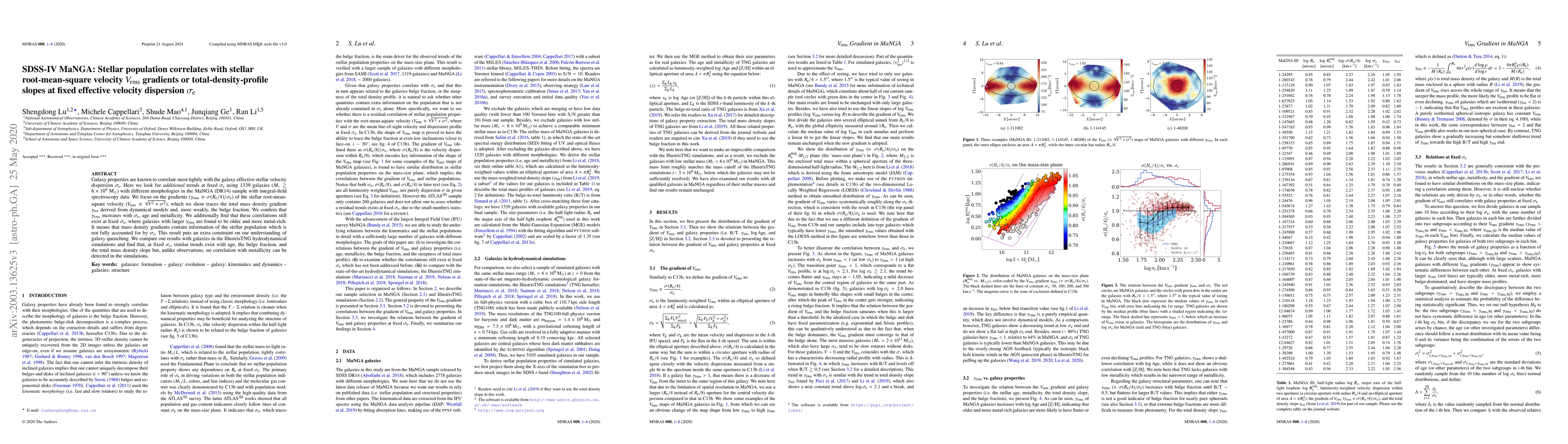 Galaxy properties are known to correlate most tightly with the galaxy effective stellar velocity dispersion $\sigma_{\rm e}$. Here we look for {\em additional} trends at fixed $\sigma_{\rm e}$ using 1339 galaxies ($M_\ast \gtrsim 6\times10^9$ M$_\odot$) with different morphologies in the MaNGA (DR14) sample with integral-field spectroscopy data. We focus on the gradients ($\gamma_{\rm rms} \equiv \sigma(R_{\rm e}/4)/\sigma_{\rm e}$) of the stellar root-mean-square velocity ($V_{\rm rms} \equiv \sqrt{V^2 + \sigma^2}$), which we show traces the total mass density gradient $\gamma_{\rm tot}$ derived from dynamical models and, more weakly, the bulge fraction. We confirm that $\gamma_{\rm rms}$ increases with $\sigma_{\rm e}$, age and metallicity. We additionally find that these correlations still exist at fixed $\sigma_{\rm e}$, where galaxies with larger $\gamma_{\rm rms}$ are found to be older and more metal-rich. It means that mass density gradients contain information of the stellar population which is not fully accounted for by $\sigma_{\rm e}$. This result puts an extra constraint on our understanding of galaxy quenching. We compare our results with galaxies in the IllustrisTNG hydrodynamical simulations and find that, at fixed $\sigma_{\rm e}$, similar trends exist with age, the bulge fraction, and the total mass density slope but, unlike observations, no correlation with metallicity can be detected in the simulations.