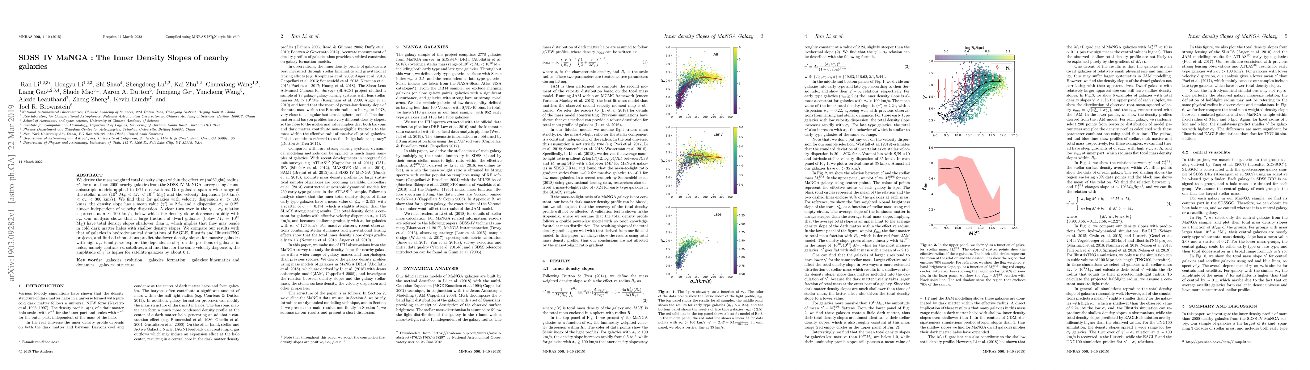This paper analyzes the inner density slopes of over 2000 nearby galaxies from the SDSS-IV MaNGA survey, finding that galaxies with high velocity dispersions exhibit a nearly constant density slope, while lower dispersion galaxies show a rapid decrease. Dwarf galaxies suggest residing in halos with shallow density slopes.