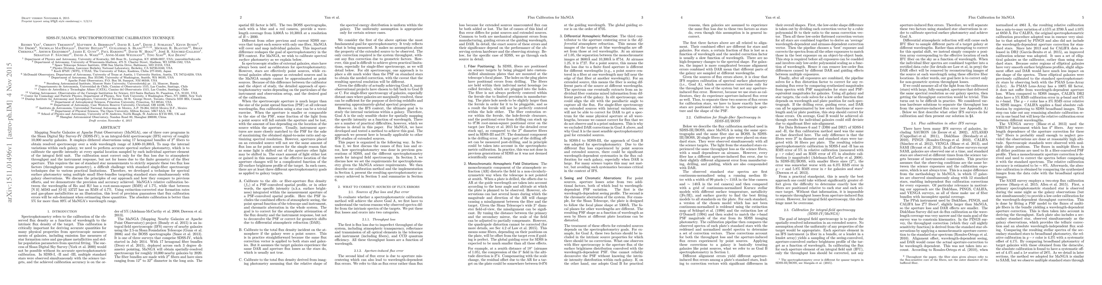 The MaNGA survey in SDSS-IV employs a novel spectrophotometric calibration technique using multiple fiber-bundles to accurately calibrate spectral surface photometry for internal galaxy variations. This method achieves high precision, with relative calibration RMS of 1.7% between H$\alpha$ and H$\beta$, and better than 5% absolute calibration over 89% of the wavelength range.