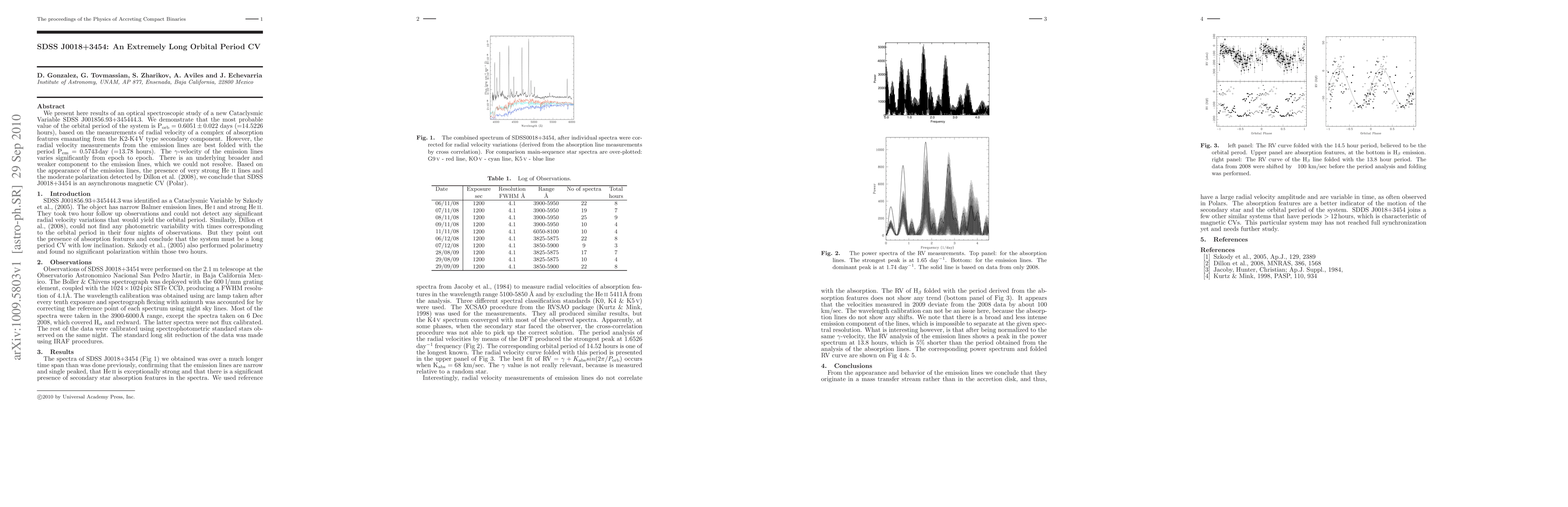 We present here results of an optical spectroscopic study of a new Cataclysmic Variable SDSS J001856.93+345444.3. We demonstrate that the most probable value of the orbital period of the system is Porb = 0.6051 \pm 0.022 days (=14.5226 hours), based on the measurements of radial velocity of a complex of absorption features emanating from the K2-K4V type secondary component. However, the radial velocity measurements from the emission lines are best folded with the period Pem = 0.5743day (=13.78 hours). The gamma-velocity of the emission lines varies significantly from epoch to epoch. There is an underlying broader and weaker component to the emission lines, which we could not resolve. Based on the appearance of the emission lines, the presence of very strong He II lines and the moderate polarization detected by Dillon et al. (2008), we conclude that SDSS J0018+3454 is an asynchronous magnetic CV (Polar).