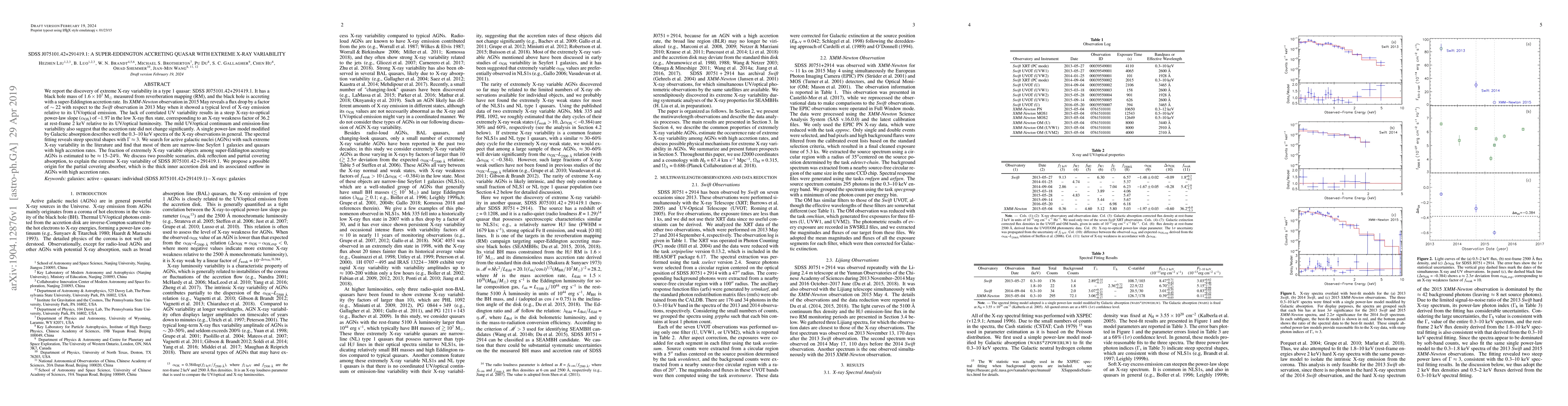 SDSS J075101.42+291419.1 is a super-Eddington accreting quasar exhibiting extreme X-ray variability, with a significant flux drop observed in 2015 compared to 2013. The X-ray weakness factor is high, suggesting mechanisms like disk reflection or partial covering absorption.