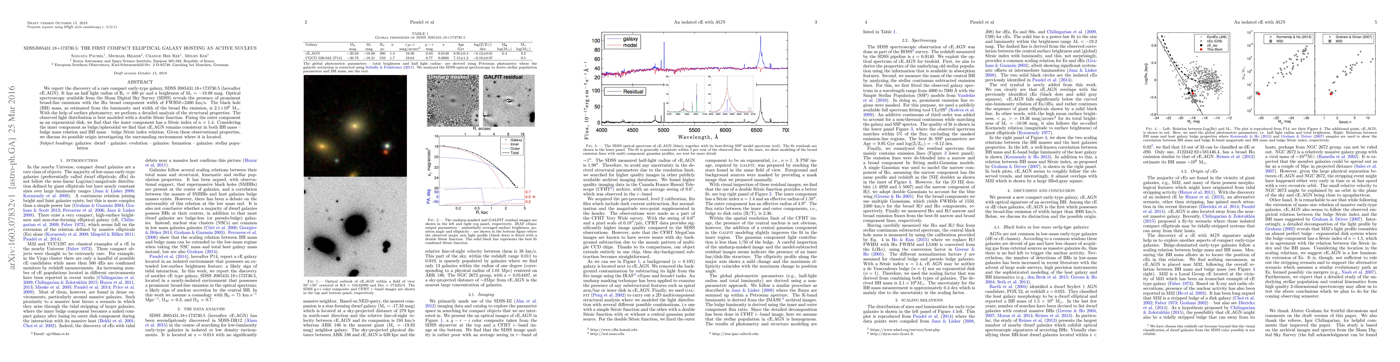 We report the discovery of a rare compact early-type galaxy, SDSS J085431.18+173730.5 (hereafter cE\_AGN). It has an half light radius of R$_{e}$ = 490 pc and a brightness of M$_{r}$ = $-$18.08 mag. Optical spectroscopy available from the Sloan Digital Sky Survey (SDSS) reveals the presence of prominent broad-line emissions with the H$\alpha$ broad component width of FWHM=2400 km/s. The black hole (BH) mass, as estimated from the luminosity and width of the broad H$\alpha$ emission, is 2.1$\times$10$^{6}$ M$_{\sun}$. With the help of surface photometry, we perform a detailed analysis of the structural properties. The observed light distribution is best modeled with a double S\'ersic function. Fixing the outer component as an exponential disk, we find that the inner component has a S\'ersic index of n = 1.4. Considering the inner component as bulge/spheroidal we find that cE\_AGN remains consistent in both BH mass -- bulge mass relation and BH mass -- bulge S\'ersic index relation. Given these observational properties, we discuss its possible origin investigating the surrounding environment where it is located.