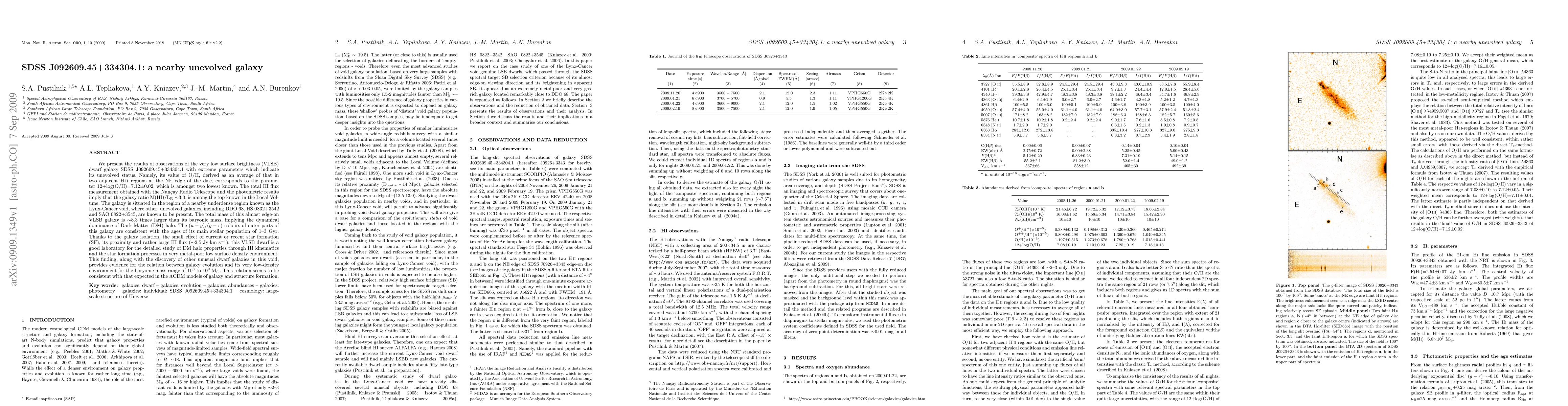 We present the results of observations of the very low surface brightness (VLSB) dwarf galaxy SDSS J092609.45+334304.1 with extreme parameters which indicate its unevolved status. Namely, its value of O/H, derived as an average of that in two adjacent HII regions at the NE edge of the disc, corresponds to the parameter 12+log(O/H)=7.12+-0.02, which is amongst two lowest known. The total HI flux measurement obtained with the Nancay Radio Telescope and the photometric results imply that the galaxy ratio M(HI)/L_B ~3.0, is among the top known in the Local Volume. The galaxy is situated in the region of a nearby underdense region known as the Lynx-Cancer void, where other, unevolved galaxies, including DDO 68, HS 0832+3542 and SAO 0822+3545, are known to be present. The total mass of this almost edge-on VLSB galaxy is ~8.3 times larger than its baryonic mass, implying the dynamical dominance of Dark Matter (DM) halo. The (u-g), (g-r) colours of outer parts of this galaxy are consistent with the ages of its main stellar population of 1--3 Gyr. Thanks to the galaxy isolation, the small effect of current or recent star formation (SF), its proximity and rather large HI flux (~2.5 Jy km/s), this VLSB dwarf is a good laboratory for the detailed study of DM halo properties through HI kinematics and the star formation processes in very metal-poor low surface density environment. This finding, along with the discovery of other unusual dwarf galaxies in this void, provides evidence for the relation between galaxy evolution and its very low-density environment for the baryonic mass range of 10^{8} to 10^{9} Mo. This relation seems to be consistent with that expected in the LambdaCDM models of galaxy and structure formation.