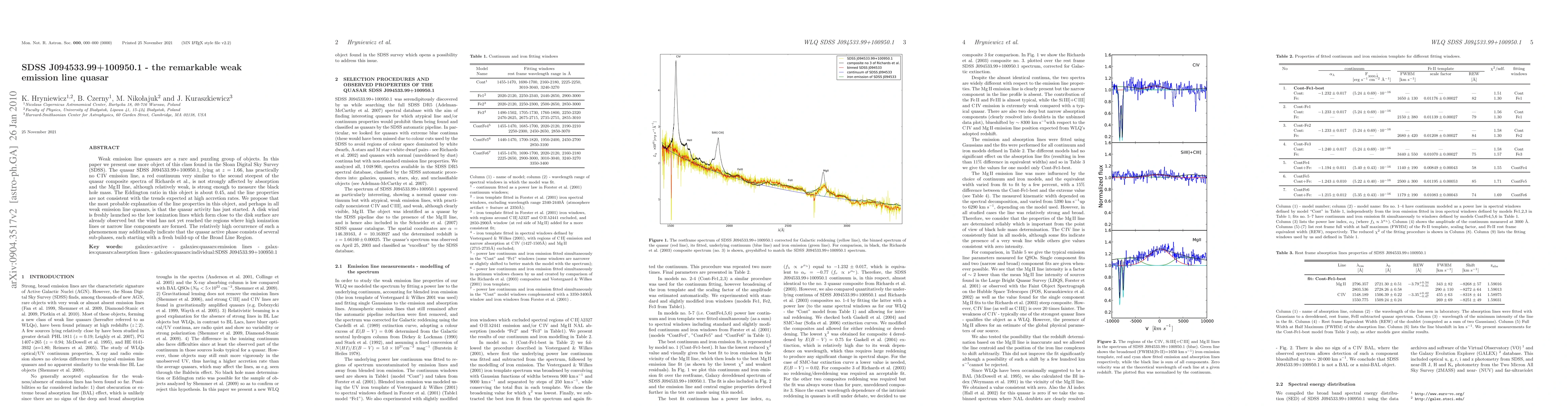 Weak emission line quasars are a rare and puzzling group of objects. In this paper we present one more object of this class found in the Sloan Digital Sky Survey (SDSS). The quasar SDSS J094533.99+100950.1, lying at z = 1.66, has practically no C IV emission line, a red continuum very similar to the second steepest of the quasar composite spectra of Richards et al., is not strongly affected by absorption and the Mg II line, although relatively weak, is strong enough to measure the black hole mass. The Eddington ratio in this object is about 0.45, and the line properties are not consistent with the trends expected at high accretion rates. We propose that the most probable explanation of the line properties in this object, and perhaps in all weak emission line quasars, is that the quasar activity has just started. A disk wind is freshly launched so the low ionization lines which form close to the disk surface are already observed but the wind has not yet reached the regions where high ionization lines or narrow line components are formed. The relatively high occurrence of such a phenomenon may additionally indicate that the quasar active phase consists of several sub-phases, each starting with a fresh build-up of the Broad Line Region.