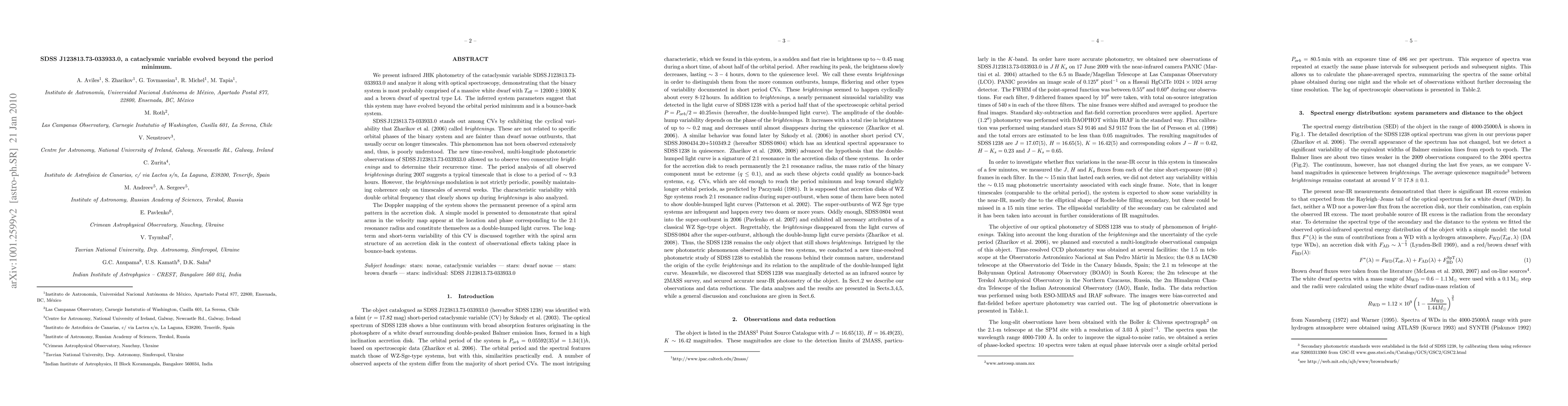 We present infrared JHK photometry of the cataclysmic variable SDSS J123813.73-033933.0 (SDSS1238)and analyze it along with optical spectroscopy, demonstrating that the binary system is most probably comprised of a massive white dwarf with Teff=12000+/-1000 K and a brown dwarf of spectral type L4. The inferred system parameters suggest that this system may have evolved beyond the orbital period minimum and is a bounce-back system. SDSS1238 stands out among CVs by exhibiting the cyclical variability (brightenings). These are not related to specific orbital phases of the binary system and are fainter than dwarf novae outbursts, that usually occur on longer timescales. This phenomenon has not been observed extensively and, thus, is poor understood. The new time-resolved, multi-longitude photometric observations of SDSS1238 allowed us to observe two consecutive brightenings and to determine their recurrence time. The period analysis of all observed brightenings during 2007 suggests a typical timescale that is close to a period of ~9.3 hours. However, the brightenings modulation is not strictly periodic, possibly maintaining coherence only on timescales of several weeks. The characteristic variability with double orbital frequency that clearly shows up during brightenings is also analyzed. The Doppler mapping of the system shows the permanent presence of a spiral arm pattern in the accretion disk. A simple model is presented to demonstrate that spiral arms in the velocity map appear at the location and phase corresponding to the 2:1 resonance radius and constitute themselves as a double-humped light curves. The long-term and short-term variability of this CV is discussed together with the spiral arm structure of an accretion disk in the context of observational effects taking place in bounce-back systems.