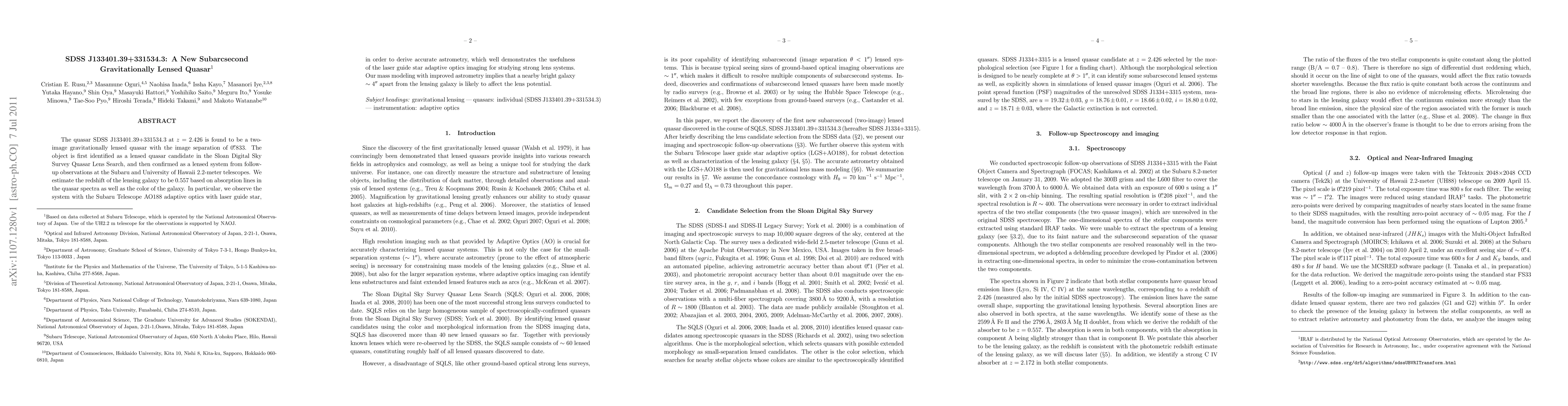 SDSS J133401.39+331534.3 is a newly discovered two-image gravitationally lensed quasar at a redshift of 2.426, confirmed through observations using the Subaru and University of Hawaii telescopes. The lensing galaxy's redshift is estimated at 0.557, and the system's astrometry was refined using Subaru Telescope's adaptive optics.