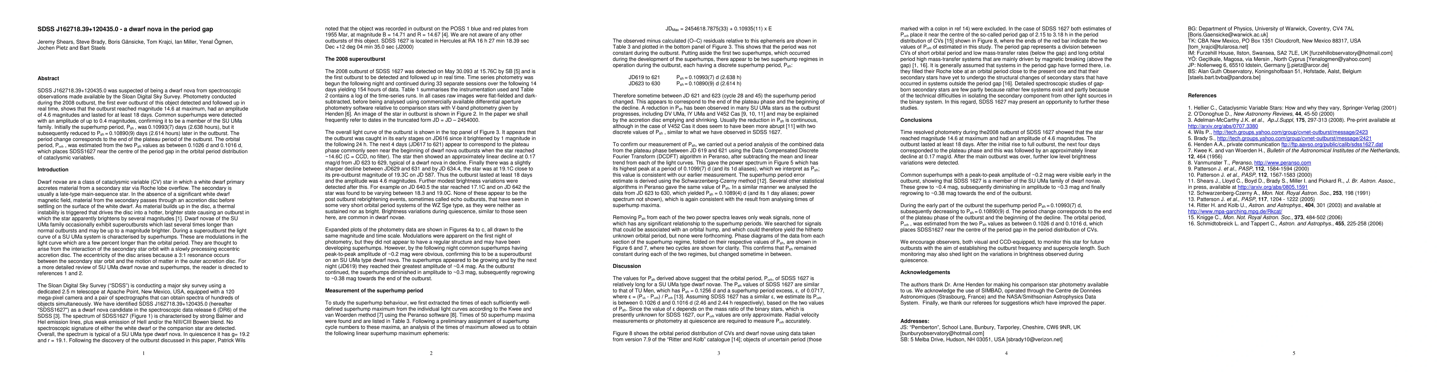 SDSS J162718.39+120435.0, a newly identified dwarf nova, experienced its first detected outburst in 2008, reaching magnitude 14.6 with an amplitude of 4.6 magnitudes. The object is confirmed to belong to the SU UMa family, showing superhumps and a period reduction indicative of its placement near the center of the period gap in cataclysmic variables.