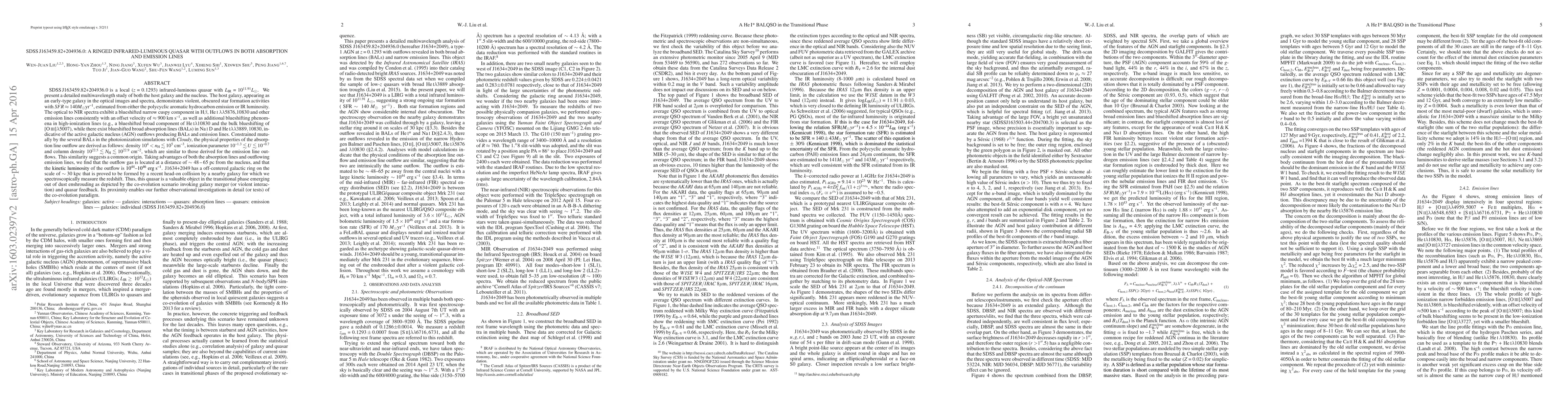 SDSS J1634+2049 is a local (z = 0.1293) infrared-luminous quasar with LIR= 10^11.91 Lsun. We present a detailed multiwavelength study of both the host galaxy and the nucleus. The host galaxy demonstrates violent, obscured star formation activities with SFR ~ 140 Msun yr^-1, estimated from either the PAH emission or IR luminosity. The optical to NIR spectra exhibit a blueshifted narrow cuspy component in Hb, HeI5876,10830 and other emission lines consistently with an offset velocity of ~900 km/s, as well as additional blueshifting phenomena in high-ionization lines , while there exist blueshifted broad absorption lines (BALs) in NaID and HeI*3889,10830, indicative of the AGN outflows producing BALs and emission lines. Constrained mutually by the several BALs with CLOUDY, the physical properties of the absorption-line outflow are derived as follows: 10^4 < n_H <= 10^5 cm^-3, 10^-1.3 <= U <= 10^-0.7 and 10^22.5<= N_H <= 10^22.9 cm^-2 , similar to those derived for the emission-line outflows. The similarity suggests a common origin. Taking advantages of both the absorption lines and outflowing emission lines, we find that the outflow gas is located at a distance of 48 - 65 pc from the nucleus, and that the kinetic luminosity of the outflow is 10^44-10^46 erg s^-1. J1634+2049 has a off-centered galactic ring on the scale of ~ 30 kpc that is proved to be formed by a recent head-on collision by a nearby galaxy. Thus this quasar is a valuable object in the transitional phase emerging out of dust enshrouding as depicted by the co-evolution scenario.