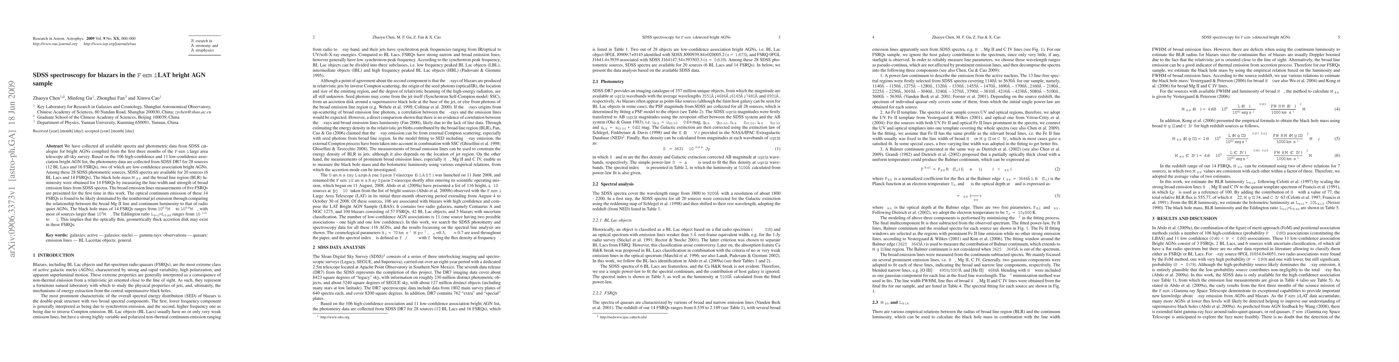 We have collected all available spectra and photometric data from SDSS catalogue for bright AGNs complied from the first three months of the Fermi large area telescope all-sky survey. Based on the 106 high-confidence and 11 low-confidence association bright AGN list, the photometry data are collected from SDSS DR7 for 28 sources (12 BL Lacs and 16 FSRQs), two of which are low-confidence association bright AGNs. Among these 28 SDSS photometric sources, SDSS spectra are available for 20 sources (6 BL Lacs and 14 FSRQs). The black hole mass M_BH and the broad line region (BLR) luminosity were obtained for 14 FSRQs by measuring the line-width and strength of broad emission lines from SDSS spectra. The broad emission lines measurements of five FSRQs are presented for the first time in this work. The optical continuum emission of these 14 FSRQs is found to be likely dominated by the nonthermal jet emission through comparing the relationship between the broad Mg II line and continuum luminosity to that of radio quiet AGNs. The black hole mass of 14 FSRQs ranges from 10^8.2 to 10^9.9 solar mass, with most of sources larger than 10^9 solar mass. The Eddington ratio L_bol/L_Edd ranges from 10^-1.5 to ~ 1. This implies that the optically thin, geometrically thick accretion disk may exist in these FSRQs.