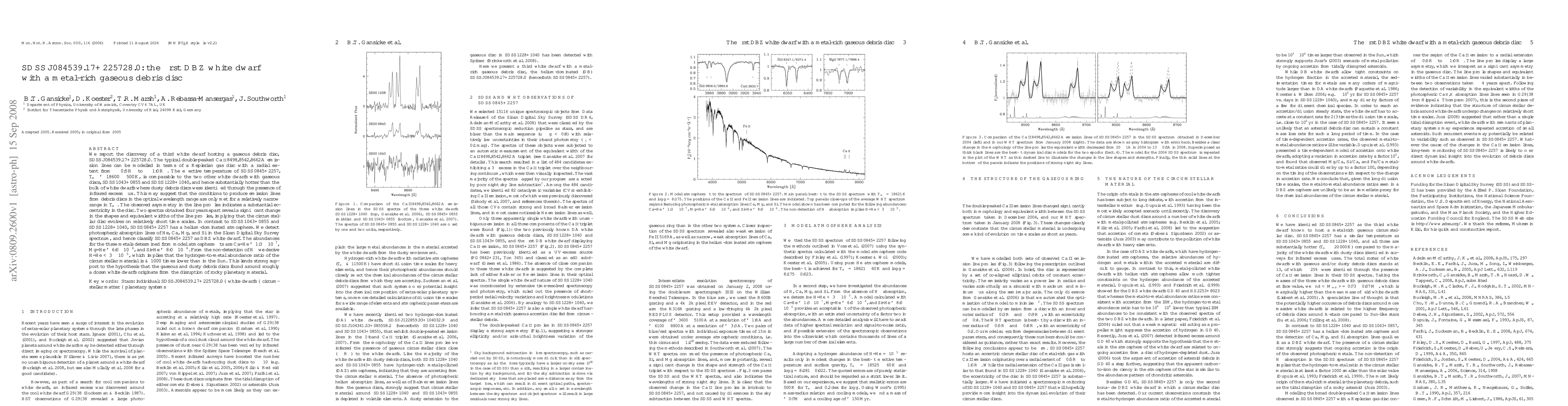 SDSSJ084539.17+225728.0 is the first DBZ white dwarf discovered to host a metal-rich gaseous debris disc, characterized by double-peaked CaII emission lines indicating a Keplerian disc with significant eccentricity. The metal-to-hydrogen ratio in the disc is over a thousand times lower than in the Sun, supporting the theory that such debris discs originate from disrupted rocky planetary material.
