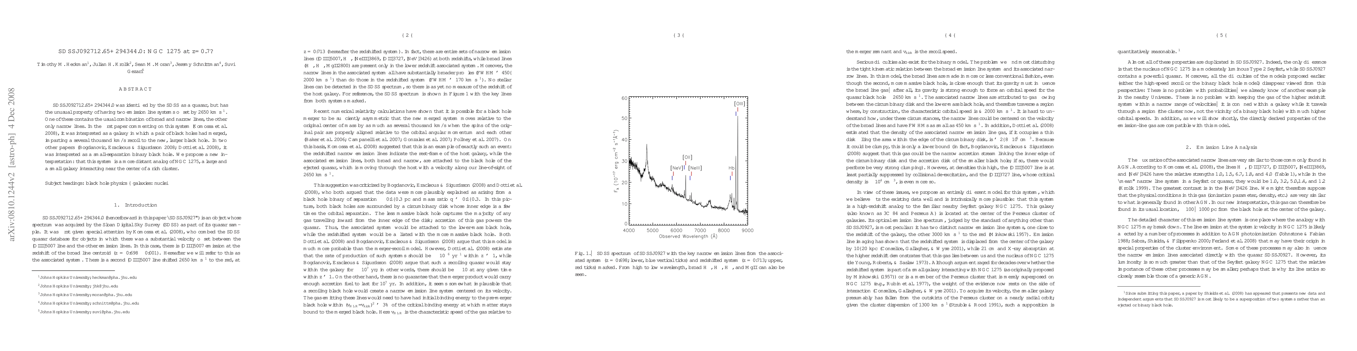 SDSSJ092712.65+294344.0 was identified by the SDSS as a quasar, but has the unusual property of having two emission line systems offset by 2650 km/s. One of these contains the usual combination of broad and narrow lines, the other only narrow lines. In the first paper commenting on this system (Komossa et al. 2008), it was interpreted as a galaxy in which a pair of black holes had merged, imparting a several thousand km/s recoil to the new, larger black hole. In two other papers (Bogdanovic, Eracleous & Sigurdsson 2008; Dotti et al. 2008), it was interpreted as a small-separation binary black hole. We propose a new interpretation: that this system is a more distant analog of NGC1275, a large and a small galaxy interacting near the center of a rich cluster.