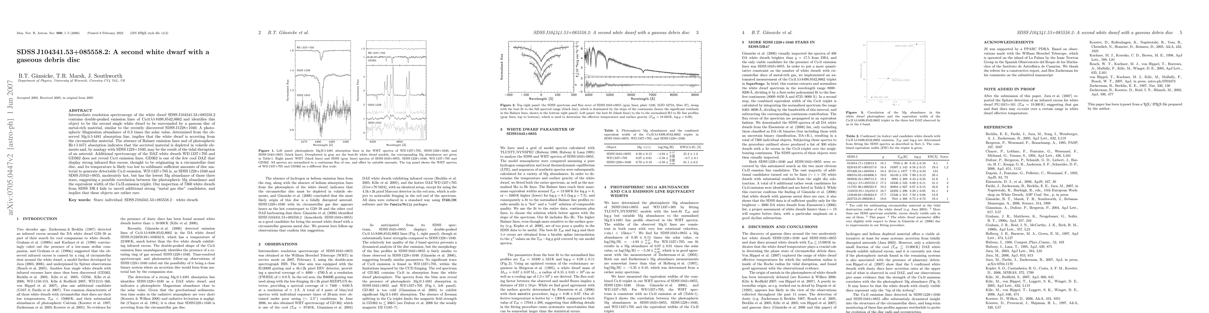 Intermediate resolution spectroscopy of the white dwarf SDSSJ104341.53+085558.2 contains double-peaked emission lines of CaII8498,8542,8662 and identifies this object to be the second single white dwarf to be surrounded by a gaseous disc of metal-rich material, similar to the recently discovered SDSSJ1228+1040. A photospheric Magnesium abundance of 0.3 times the solar value, determined from the observed MgII4481 absorption line, implies that the white dwarf is accreting from the circumstellar material. The absence of Balmer emission lines and of photospheric HeI4471 absorption indicates that the accreted material is depleted in volatile elements and, by analogy with SDSS1228+1040, may be the result of the tidal disruption of an asteroid. Additional spectroscopy of the DAZ white dwarfs WD1337+705 and GD362 does not reveal CaII emission lines. GD362 is one of the few cool DAZ that display strong infrared flux excess, thought to be originating in a circumstellar dust disc, and its temperature is likely too low to sublimate sufficient amounts of disc material to generate detectable CaII emission. WD1337+705 is, as SDSS1228+1040 and SDSS1043+0855, moderately hot, but has the lowest Mg abundance of those three stars, suggesting a possible correlation between the photospheric Mg abundance and the equivalent width of the CaII emission triplet. Our inspection of 7360 white dwarfs from SDSS DR4 fails to unveil additional strong "metal gas disc" candidates, and implies that these objects are rather rare.