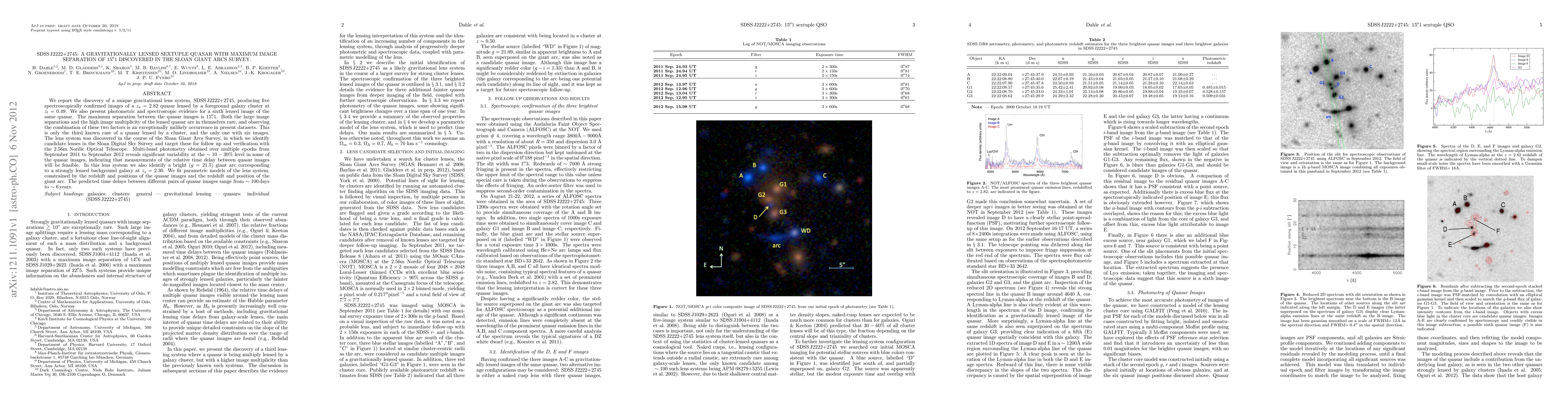 The paper reports the discovery of SDSSJ2222+2745, a rare sextuple quasar lensed by a foreground galaxy cluster, with a maximum image separation of 15.1". The system's unique combination of large separation and high image multiplicity makes it an exceptional case, with predicted time delays between images ranging from 100 days to 6 years.