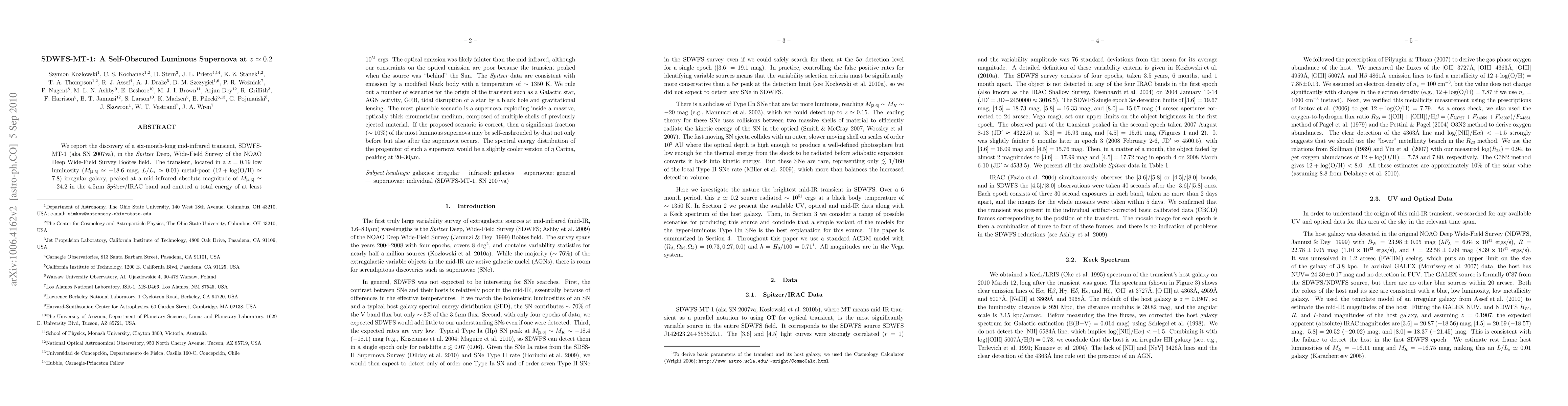 We report the discovery of a six-month-long mid-infrared transient, SDWFS-MT-1 (aka SN 2007va), in the Spitzer Deep, Wide-Field Survey of the NOAO Deep Wide-Field Survey Bootes field. The transient, located in a z=0.19 low luminosity (M_[4.5]~-18.6 mag, L/L_MilkyWay~0.01) metal-poor (12+log(O/H)~7.8) irregular galaxy, peaked at a mid-infrared absolute magnitude of M_[4.5]~-24.2 in the 4.5 micron Spitzer/IRAC band and emitted a total energy of at least 10^51 ergs. The optical emission was likely fainter than the mid-infrared, although our constraints on the optical emission are poor because the transient peaked when the source was "behind" the Sun. The Spitzer data are consistent with emission by a modified black body with a temperature of ~1350 K. We rule out a number of scenarios for the origin of the transient such as a Galactic star, AGN activity, GRB, tidal disruption of a star by a black hole and gravitational lensing. The most plausible scenario is a supernova exploding inside a massive, optically thick circumstellar medium, composed of multiple shells of previously ejected material. If the proposed scenario is correct, then a significant fraction (~10%) of the most luminous supernova may be self-enshrouded by dust not only before but also after the supernova occurs. The spectral energy distribution of the progenitor of such a supernova would be a slightly cooler version of eta Carina, peaking at 20-30 microns.