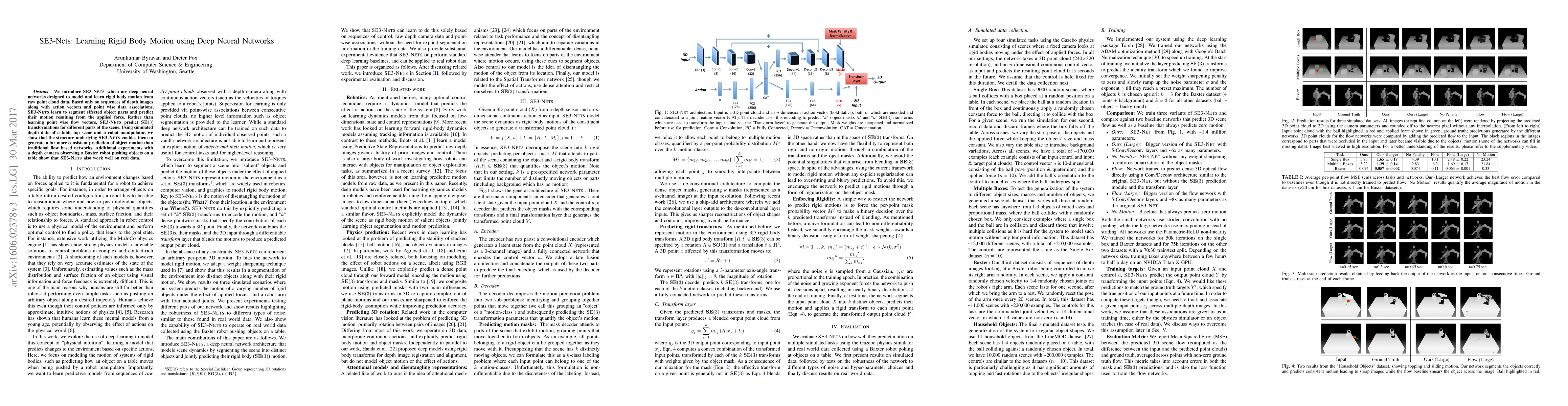 SE3-Nets are deep neural networks designed to model rigid body motion from point cloud data, predicting SE3 transformations instead of point-wise flow vectors, resulting in more consistent motion predictions compared to traditional methods. They perform well on both simulated and real-world data involving object manipulation.
