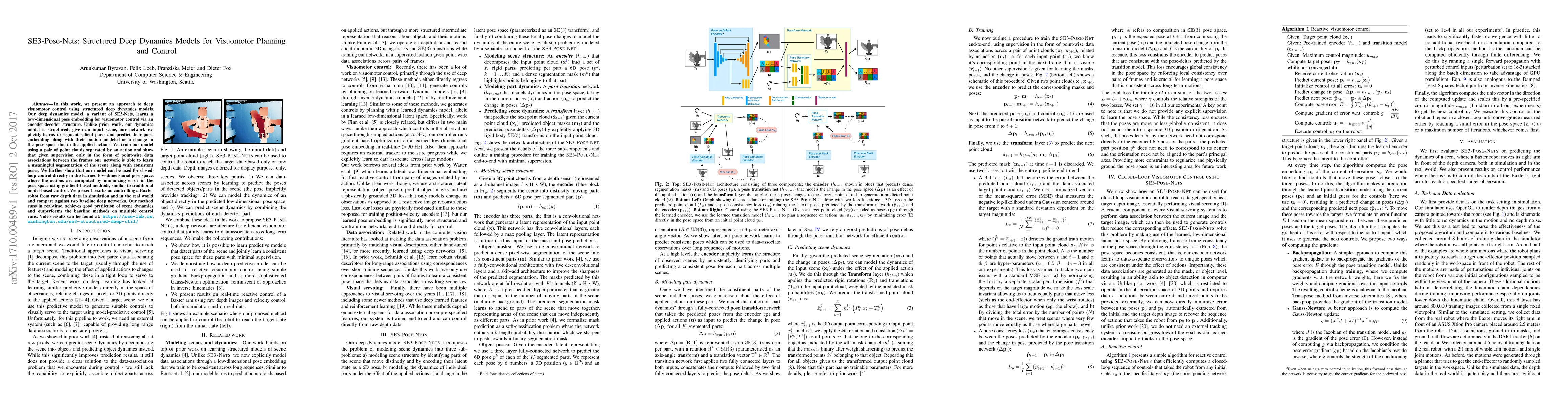 This paper introduces SE3-Pose-Nets, a structured deep dynamics model for visuomotor planning and control, which learns low-dimensional pose embeddings via an encoder-decoder structure. The model segments salient parts of a scene and predicts their pose changes due to actions, achieving real-time performance and outperforming baseline methods in controlling a Baxter robot.