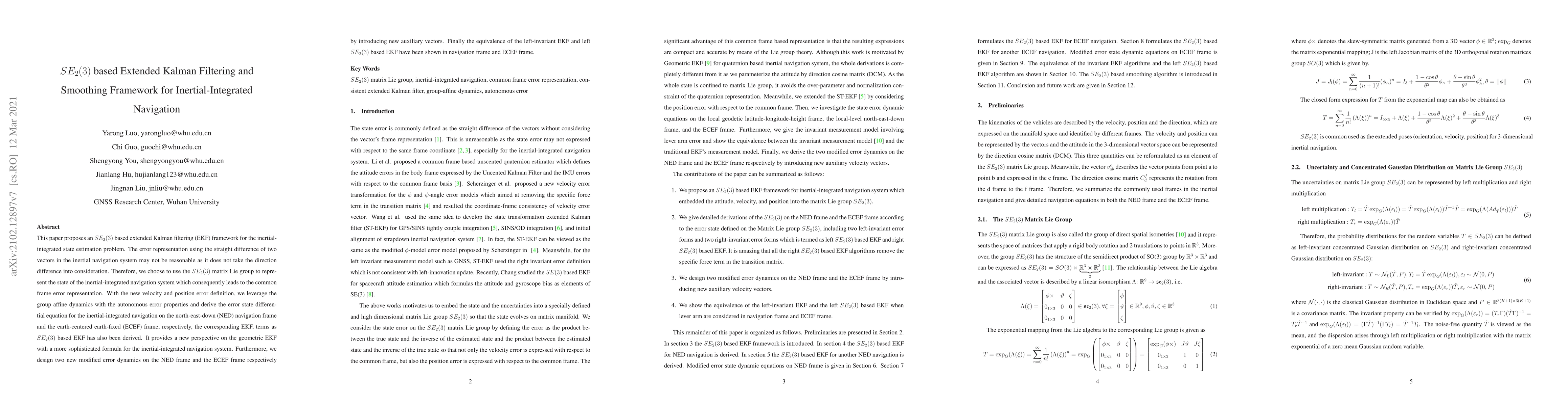 This paper proposes an $SE_2(3)$ based extended Kalman filtering (EKF) framework for the inertial-integrated state estimation problem. The error representation using the straight difference of two vectors in the inertial navigation system may not be reasonable as it does not take the direction difference into consideration. Therefore, we choose to use the $SE_2(3)$ matrix Lie group to represent the state of the inertial-integrated navigation system which consequently leads to the common frame error representation. With the new velocity and position error definition, we leverage the group affine dynamics with the autonomous error properties and derive the error state differential equation for the inertial-integrated navigation on the north-east-down (NED) navigation frame and the earth-centered earth-fixed (ECEF) frame, respectively, the corresponding EKF, terms as $SE_2(3)$ based EKF has also been derived. It provides a new perspective on the geometric EKF with a more sophisticated formula for the inertial-integrated navigation system. Furthermore, we design two new modified error dynamics on the NED frame and the ECEF frame respectively by introducing new auxiliary vectors. Finally the equivalence of the left-invariant EKF and left $SE_2(3)$ based EKF have been shown in navigation frame and ECEF frame.