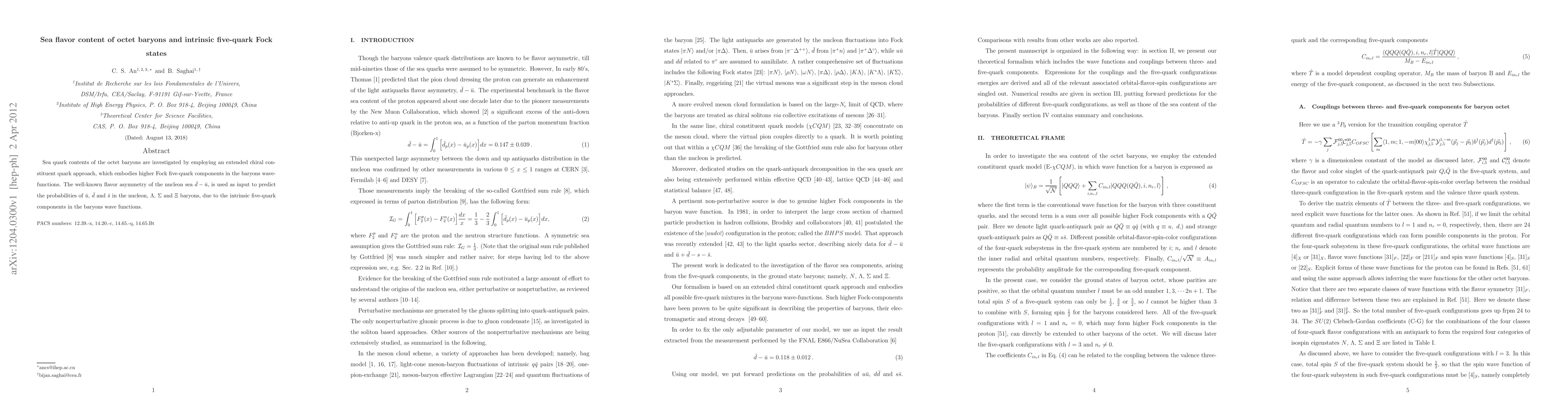 Sea quark contents of the octet baryons are investigated by employing an extended chiral constituent quark approach, which embodies higher Fock five-quark components in the baryons wave-functions. The well-known flavor asymmetry of the nucleon sea $\bar{d}-\bar{u}$, is used as input to predict the probabilities of $\bar{u}$, $\bar{d}$ and $\bar{s}$ in the nucleon, $\Lambda$, $\Sigma$ and $\Xi$ baryons, due to the intrinsic five-quark components in the baryons wave functions.