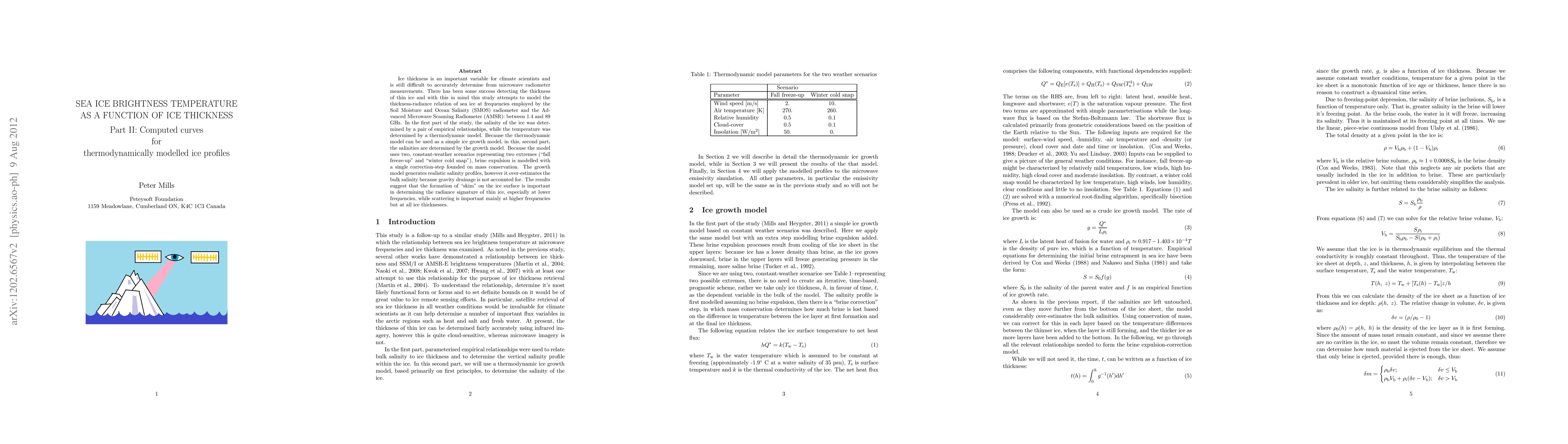 This study models the relationship between sea ice thickness and brightness temperature at microwave frequencies used by SMOS and AMSR, using a thermodynamic model to determine ice salinity. The model generates realistic salinity profiles but overestimates bulk salinity due to lack of gravity drainage consideration, highlighting the importance of "skim" formation and scattering in determining radiance signatures at different frequencies.