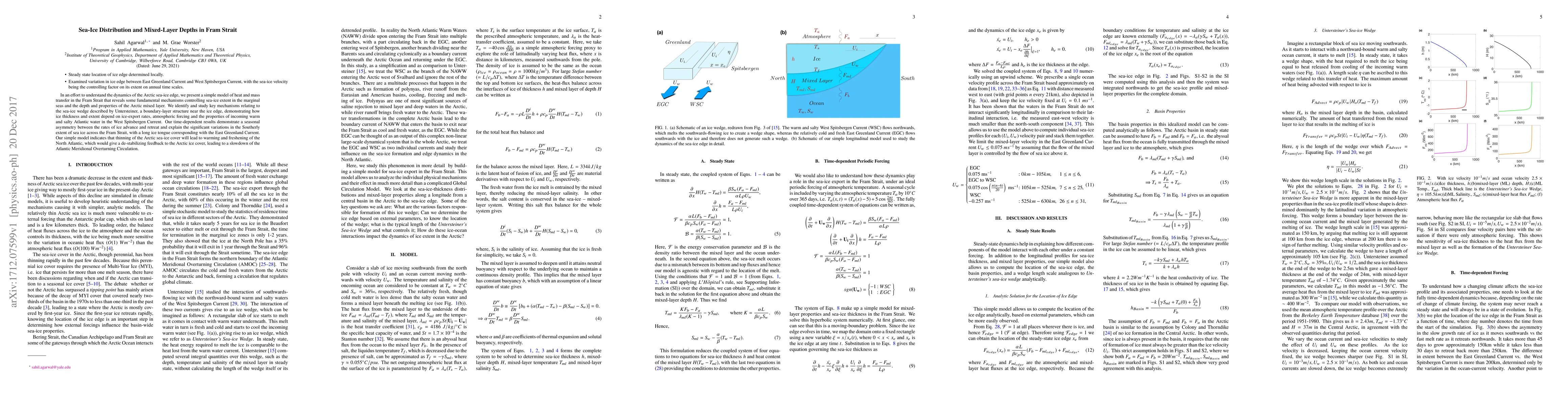 This research models heat and mass transfer in the Fram Strait to understand mechanisms controlling sea-ice extent and the Arctic mixed-layer depths, revealing seasonal asymmetry in ice advance and retreat rates and identifying feedback loops that could destabilize the Arctic ice cover and impact the Atlantic Meridional Overturning Circulation.