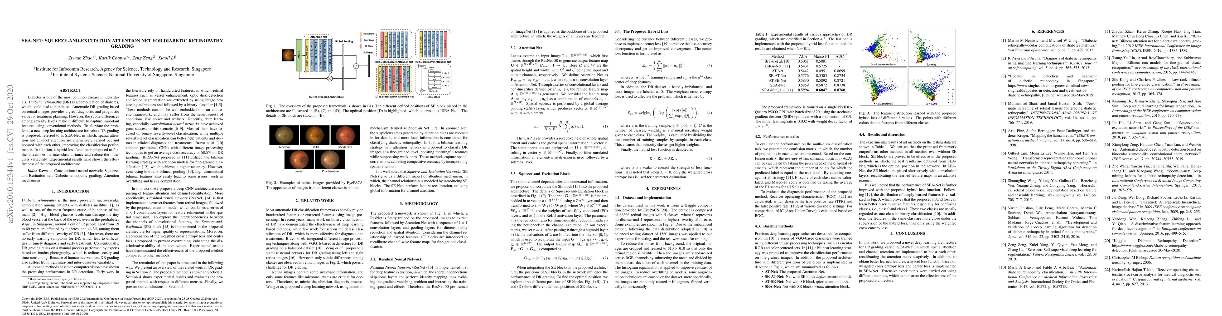 The paper proposes SEA-Net, a deep learning architecture incorporating spatial and channel attention mechanisms to improve the automatic grading of diabetic retinopathy (DR) from retinal images. The hybrid loss function further enhances inter-class distance and reduces intra-class variability, demonstrating effective performance in experimental results.