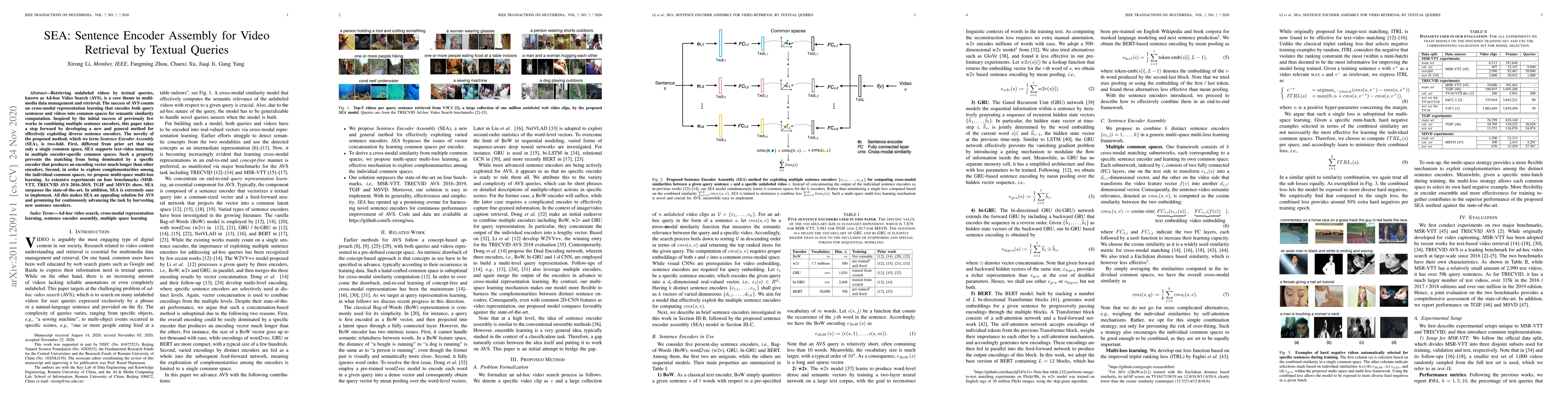 A new method called Sentence Encoder Assembly (SEA) improves video retrieval by textual queries by using multiple common spaces for text-video matching, outperforming the state-of-the-art in experiments on four benchmarks.