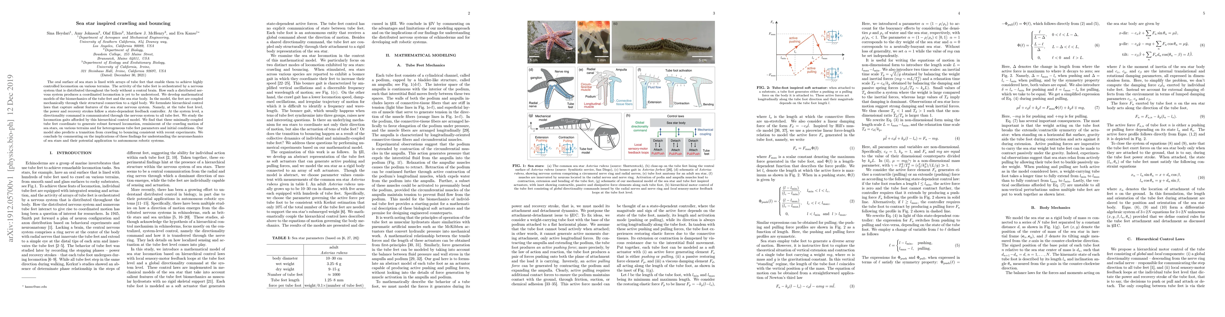 The oral surface of sea stars is lined with arrays of tube feet that enable them to achieve highly controlled locomotion on various terrains. The activity of the tube feet is orchestrated by a nervous system that is distributed throughout the body without a central brain. How such a distributed nervous system produces a coordinated locomotion is yet to be understood. We develop mathematical models of the biomechanics of the tube feet and the sea star body. In the model, the feet are coupled mechanically through their structural connection to a rigid body. We formulate hierarchical control laws that capture salient features of the sea star nervous system. Namely, at the tube foot level, the power and recovery strokes follow a state-dependent feedback controller. At the system level, a directionality command is communicated through the nervous system to all tube feet. We study the locomotion gaits afforded by this hierarchical control model. We find that these minimally-coupled tube feet coordinate to generate robust forward locomotion, reminiscent of the crawling motion of sea stars, on various terrains and for heterogeneous tube feet parameters and initial conditions. Our model also predicts a transition from crawling to bouncing consistent with recent experiments. We conclude by commenting on the implications of these findings for understanding the neuromechanics of sea stars and their potential application to autonomous robotic systems.