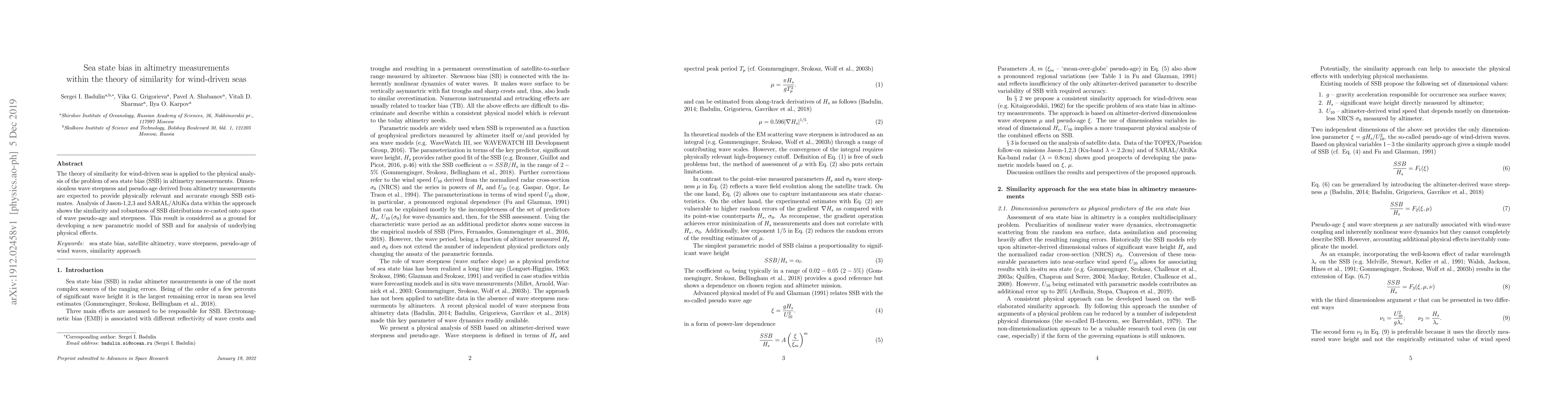 The theory of similarity for wind-driven seas is applied to the physical analysis of the problem of sea state bias (SSB) in altimetry measurements. Dimensionless wave steepness and pseudo-age derived from altimetry measurements are expected to provide {physically relevant and accurate enough} SSB estimates. Analysis of Jason-1,2,3 and SARAL/AltiKa data within the approach shows the similarity and robustness of SSB distributions re-casted onto space of wave pseudo-age and steepness. This result is considered as a ground for developing a new parametric model of SSB and for analysis of underlying physical effects.