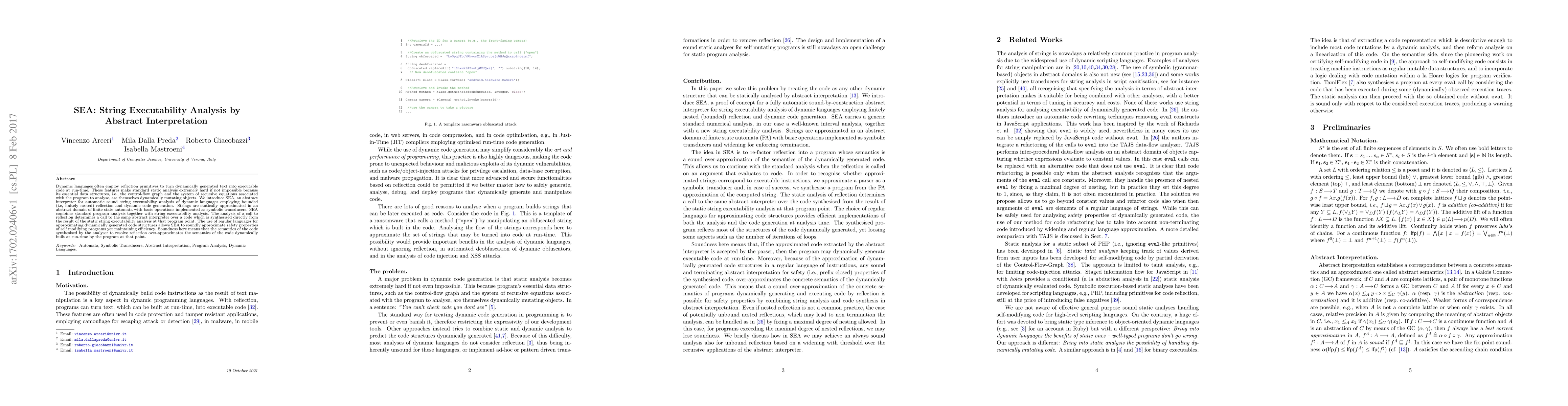 The paper introduces SEA, an abstract interpreter for string executability analysis of dynamic languages using bounded reflection and dynamic code generation. It approximates strings with finite state automata in an abstract domain, combining standard program analysis with string executability analysis.