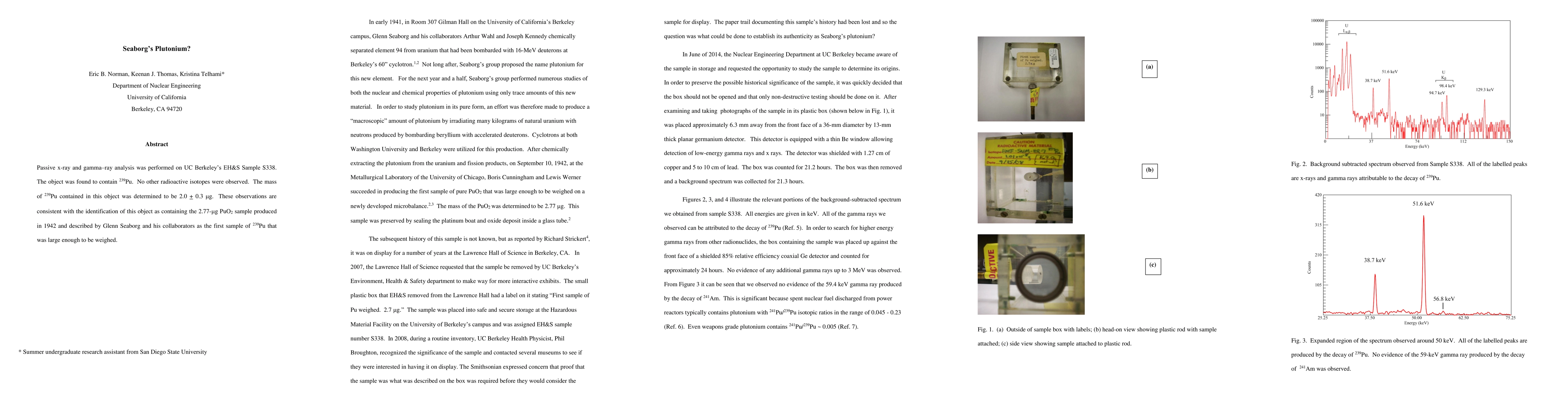 Passive x-ray and gamma-ray analysis was performed on UC Berkeley's EH&S Sample S338. The object was found to contain Pu-239 and no other radioactive isotopes. The mass of Pu-239 contained in this object was determined to be 2.0 +- 0.3 micrograms. These observations are consistent with the identification of this object being the 2.77-microgram plutonium oxide sample described by Glenn Seaborg and his collaborators as the first sample of Pu-239 that was large enough to be weighed.