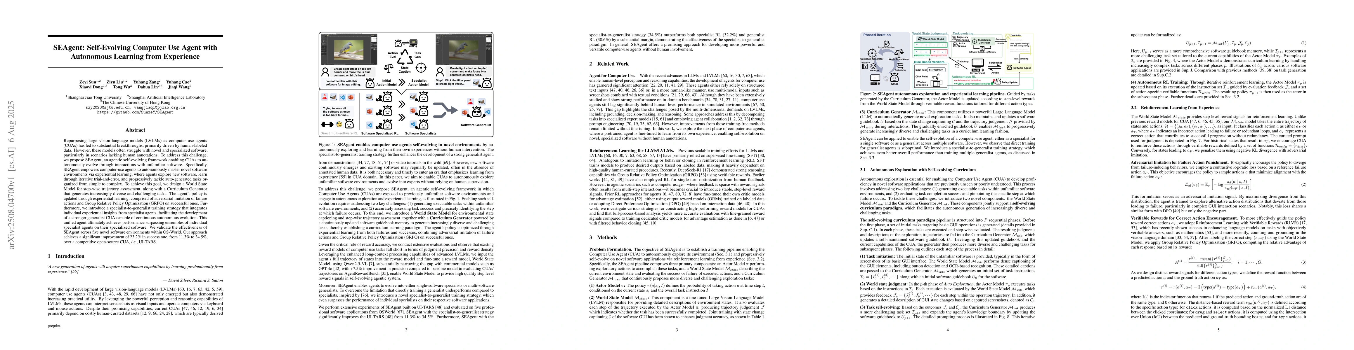 Repurposing large vision-language models (LVLMs) as computer use agents (CUAs) has led to substantial breakthroughs, primarily driven by human-labeled data. However, these models often struggle with novel and specialized software, particularly in scenarios lacking human annotations. To address this challenge, we propose SEAgent, an agentic self-evolving framework enabling CUAs to autonomously evolve through interactions with unfamiliar software. Specifically, SEAgent empowers computer-use agents to autonomously master novel software environments via experiential learning, where agents explore new software, learn through iterative trial-and-error, and progressively tackle auto-generated tasks organized from simple to complex. To achieve this goal, we design a World State Model for step-wise trajectory assessment, along with a Curriculum Generator that generates increasingly diverse and challenging tasks. The agent's policy is updated through experiential learning, comprised of adversarial imitation of failure actions and Group Relative Policy Optimization (GRPO) on successful ones. Furthermore, we introduce a specialist-to-generalist training strategy that integrates individual experiential insights from specialist agents, facilitating the development of a stronger generalist CUA capable of continuous autonomous evolution. This unified agent ultimately achieves performance surpassing ensembles of individual specialist agents on their specialized software. We validate the effectiveness of SEAgent across five novel software environments within OS-World. Our approach achieves a significant improvement of 23.2% in success rate, from 11.3% to 34.5%, over a competitive open-source CUA, i.e., UI-TARS.