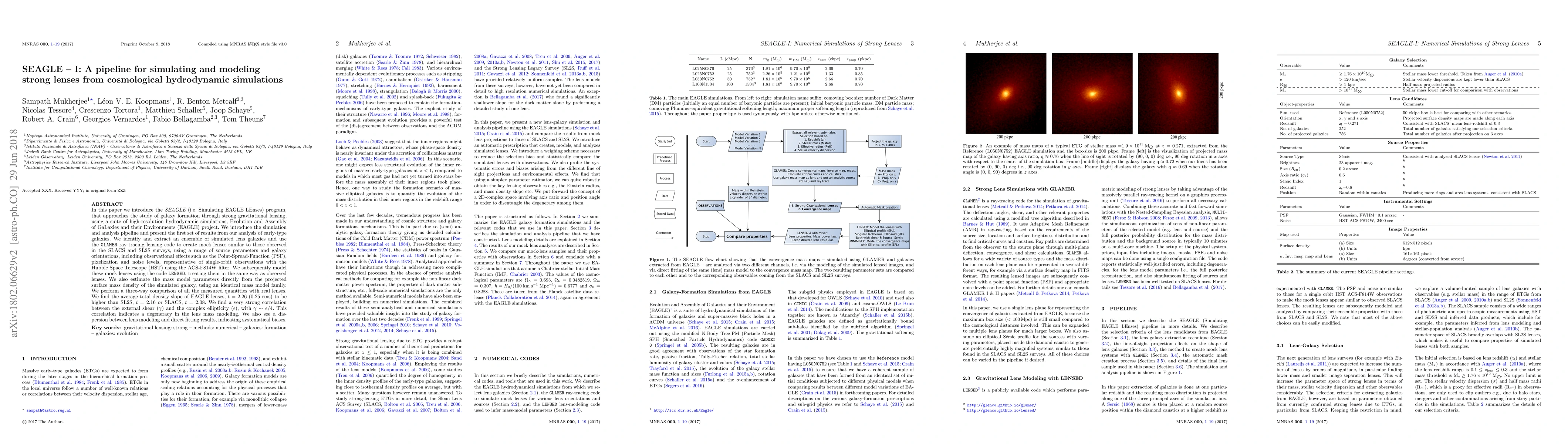 The SEAGLE program simulates and models strong gravitational lenses from EAGLE hydrodynamic simulations, creating mock lenses for early-type galaxies. The study finds EAGLE lenses have a higher average density slope than real SLACS and SL2S lenses, and reveals a strong correlation between external shear and complex ellipticity, indicating a degeneracy in mass modeling.