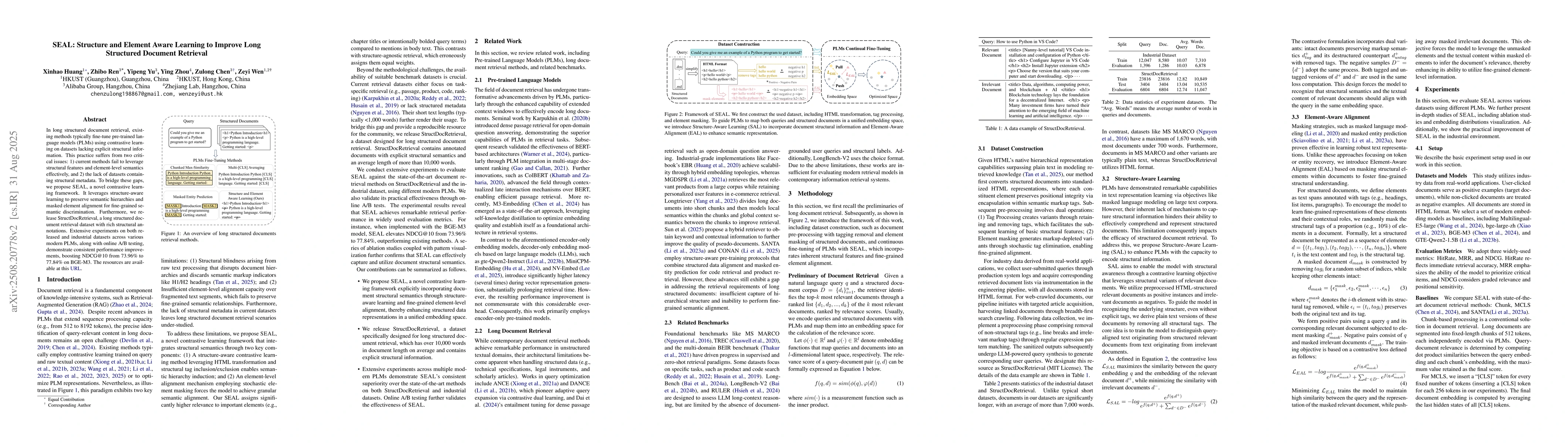 In long structured document retrieval, existing methods typically fine-tune pre-trained language models (PLMs) using contrastive learning on datasets lacking explicit structural information. This practice suffers from two critical issues: 1) current methods fail to leverage structural features and element-level semantics effectively, and 2) the lack of datasets containing structural metadata. To bridge these gaps, we propose \our, a novel contrastive learning framework. It leverages structure-aware learning to preserve semantic hierarchies and masked element alignment for fine-grained semantic discrimination. Furthermore, we release \dataset, a long structured document retrieval dataset with rich structural annotations. Extensive experiments on both released and industrial datasets across various modern PLMs, along with online A/B testing, demonstrate consistent performance improvements, boosting NDCG@10 from 73.96\% to 77.84\% on BGE-M3. The resources are available at https://github.com/xinhaoH/SEAL.